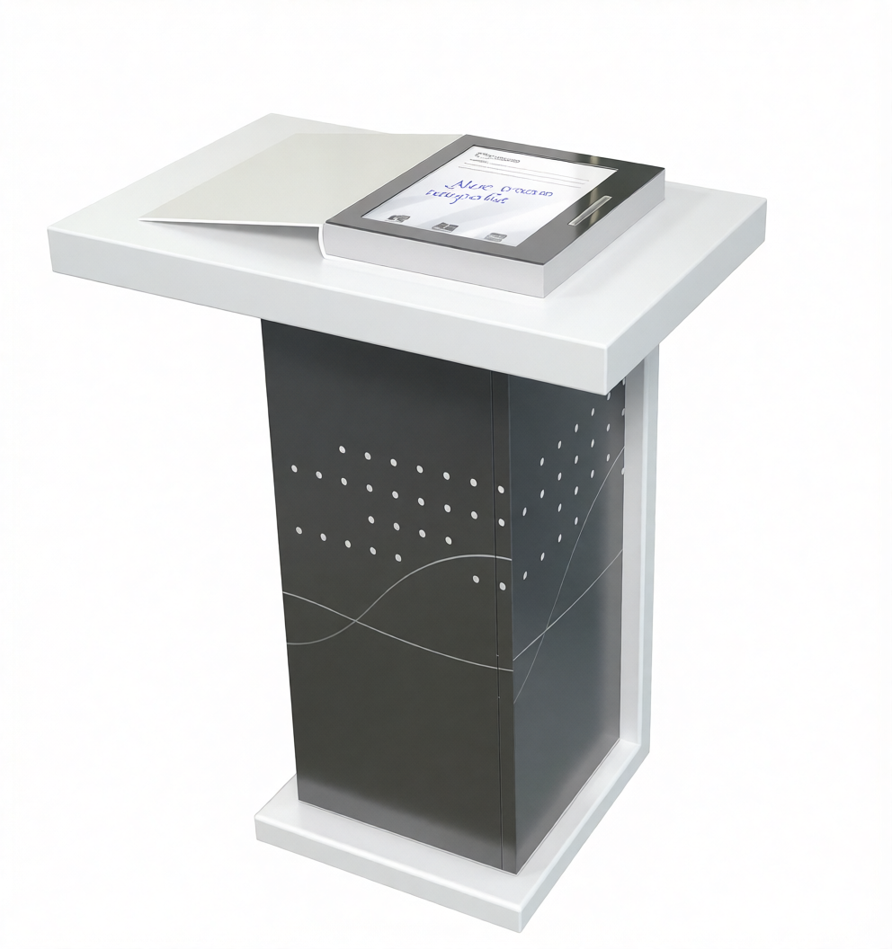 Cтойка с размещенным на нём планшетом диагональю 12,9 дюймов, интегрированным в книгу в кожаном переплете.