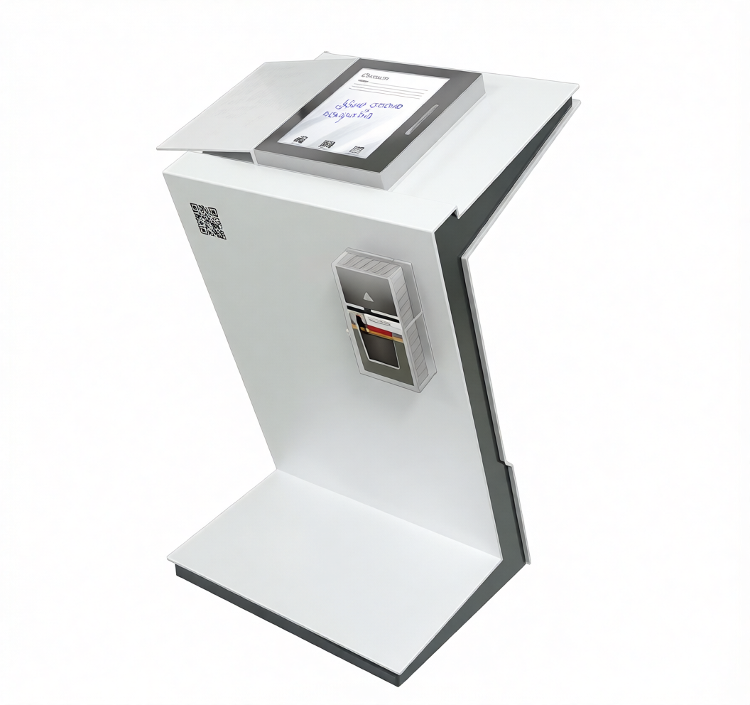 Стойка с размещенным на нём планшетом диагональю 12,9 дюймов, интегрированным в книгу в кожаном переплете.