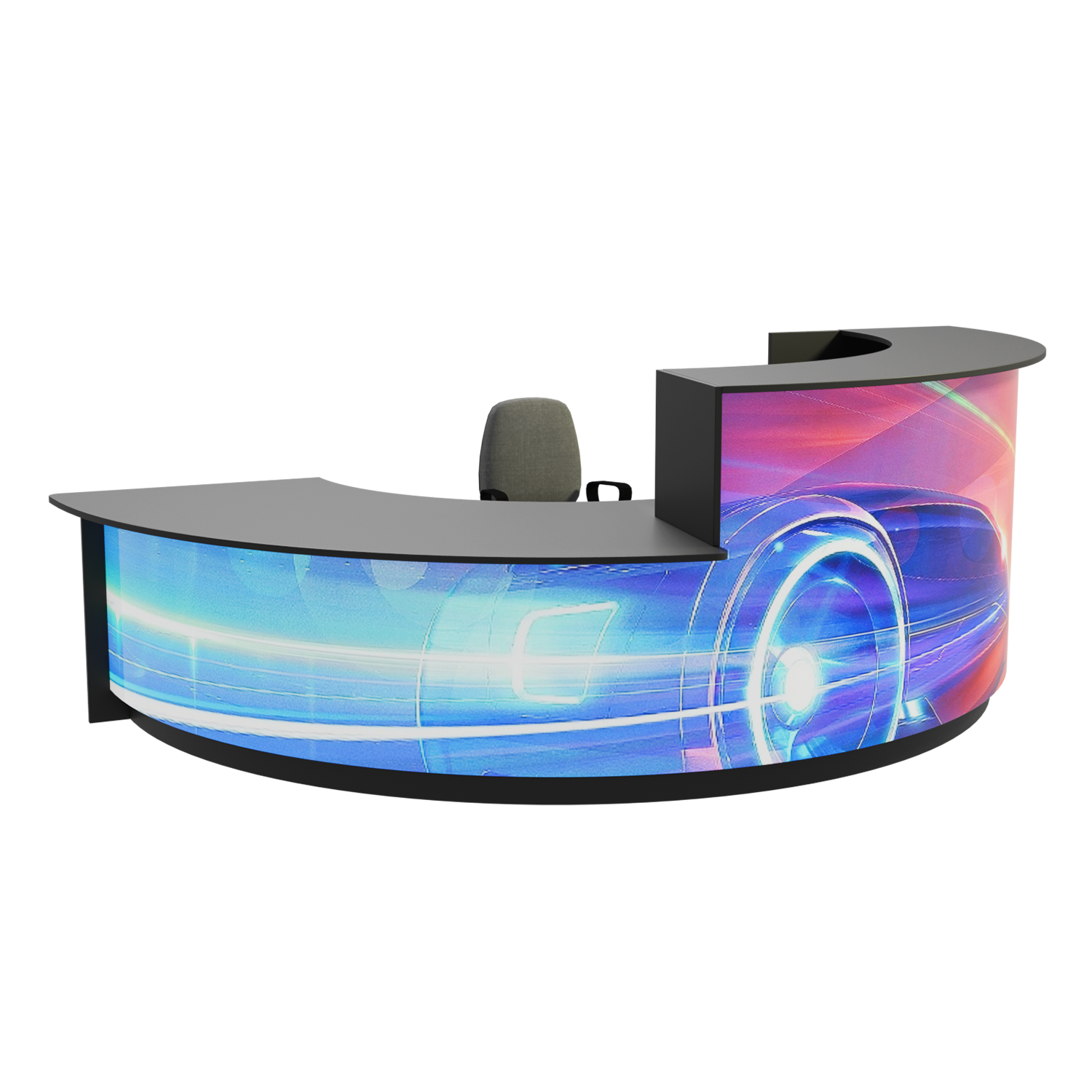 Радиусная стойка ресепшн на 1 рабочее место с экраном для демонстрации контента: навигация и т.д.