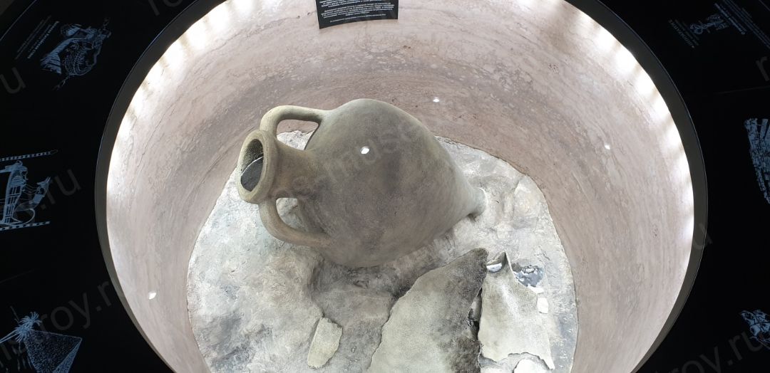 В центра зала находится эксклюзивно изготовленная витрина с "древним артефактом" - амфорой с нефтью. Пе периметру витрины размещена черно-белая инфографика с сюжетами, посвященными применению нефти в Древности.