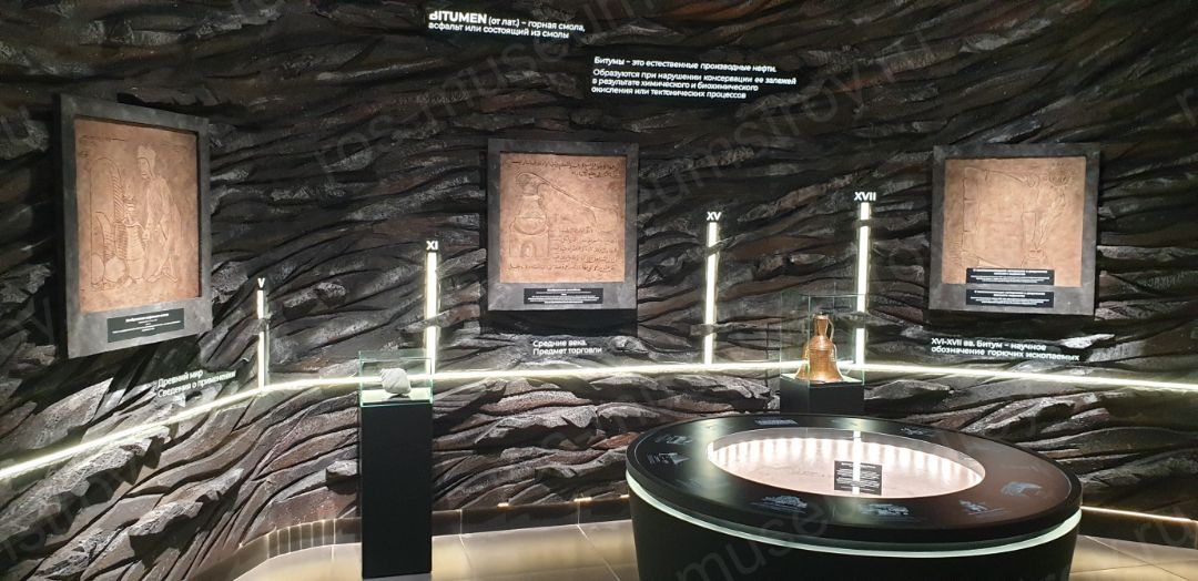 Стилистически экспозиция задекорирована под помещение штольни, в которых в Татарстане 19 веке добывали битуминозный песчаник с целью дальнейшего извлечения из него битума методом выпаривания.