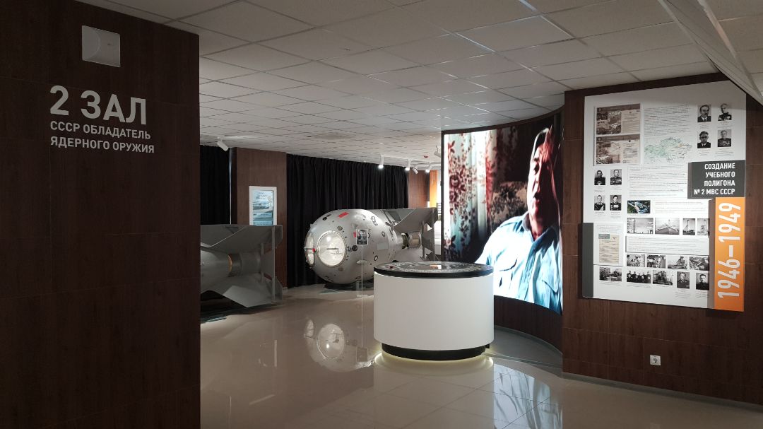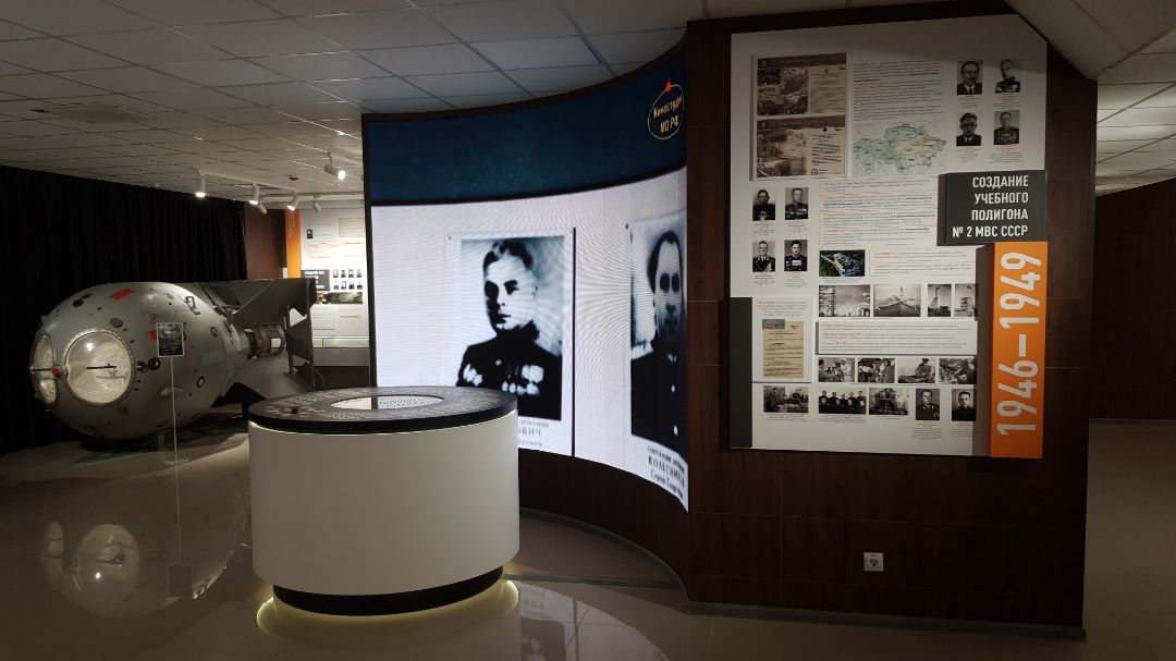 Интерактивная инсталляция «Ядерные испытания» наглядно демонстрирует посетителю выкладки из доклада Л.П. Берии и И.В. Курчатова И.В. Сталину о предварительных данных, полученных при испытании первого экземпляра атомной бомбы с зарядом из плутония, которое состоялось 29 августа 1949 года в отдаленном степном районе Казахской ССР, в 170 км западнее г. Семипалатинска.