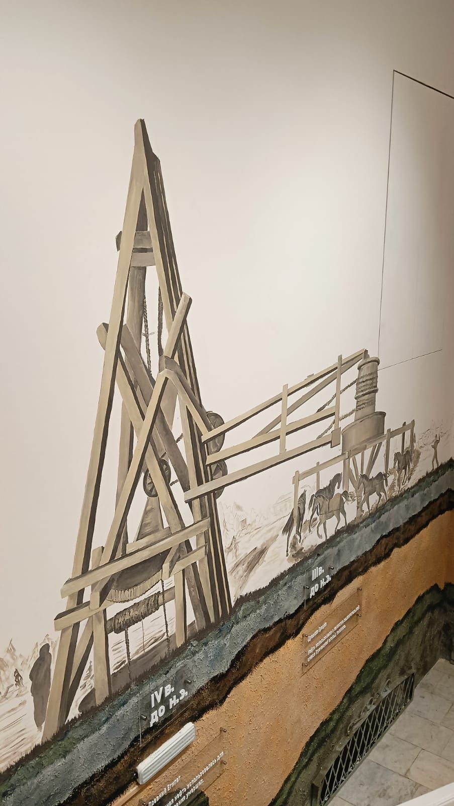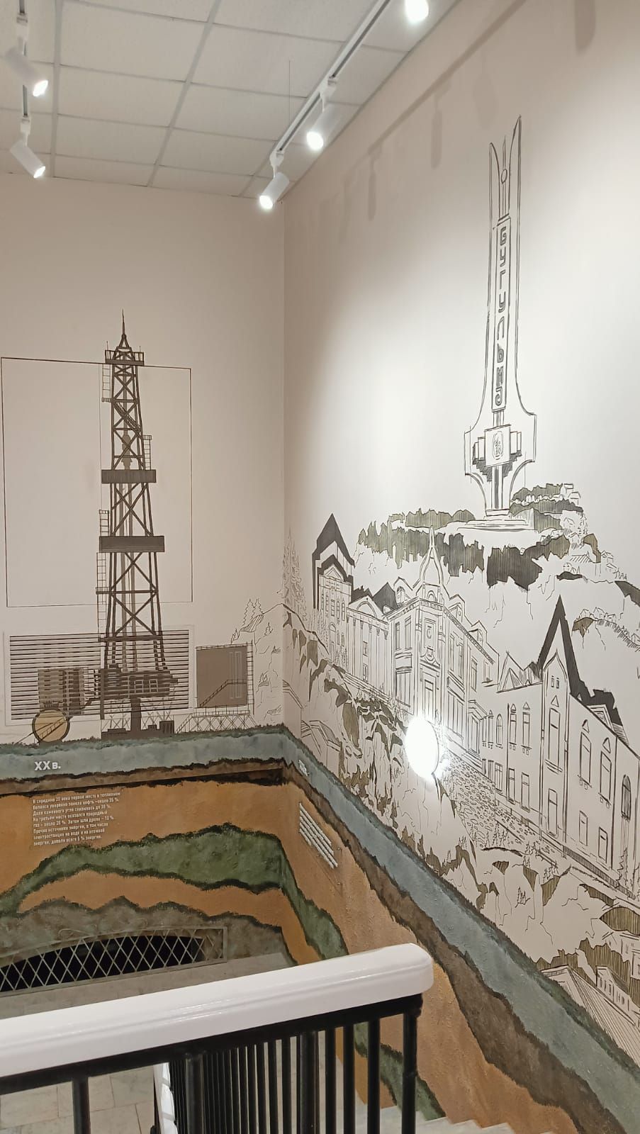 Стены лестницы, ведущей в зал, украшены тематической росписью, отражающей основную отрасль региона — нефтедобывающую промышленность. Монументальное искусство сочетает исторические мотивы с современными визуальными решениями, создавая эффект «погружения» в промышленную эпоху, которая стала локомотивом развития края.