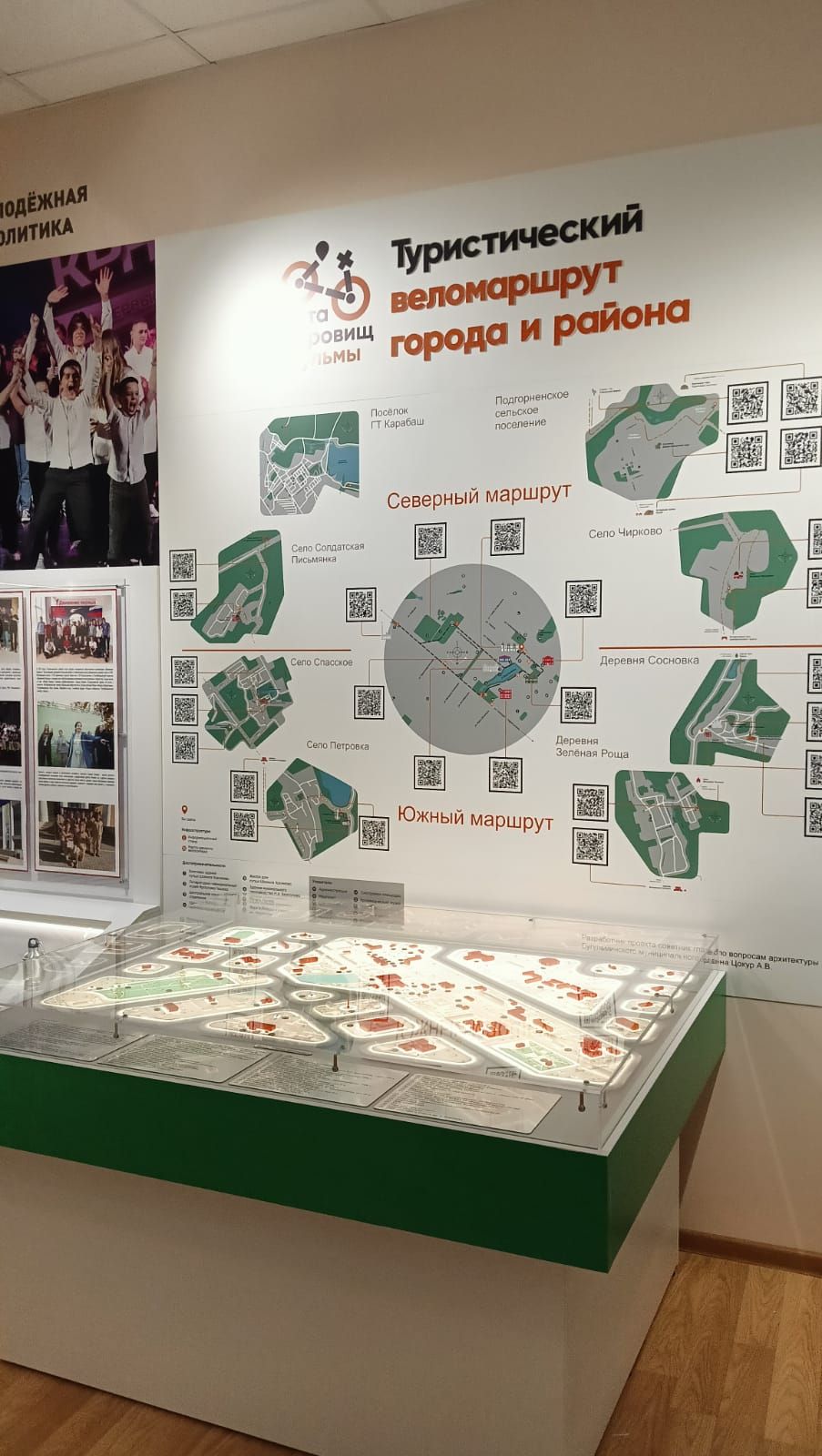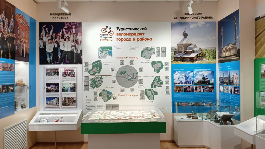 В зала размещен макет Бугульмы, демонстрирующий туристический веломаршрут города и района.