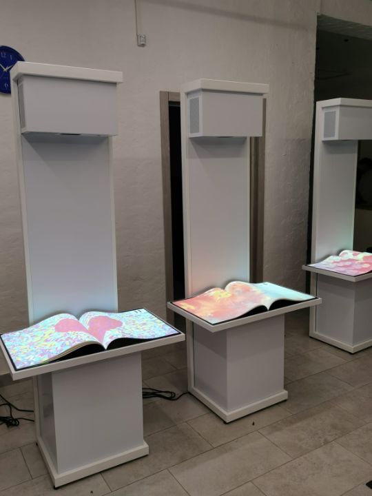 Интерактивная книга - это электронная книга с реальными страницами, на которые проецируется изображение, изменяющееся при перелистывании страницы. Возможна демонстрация фото- видео- аудио- материалов.