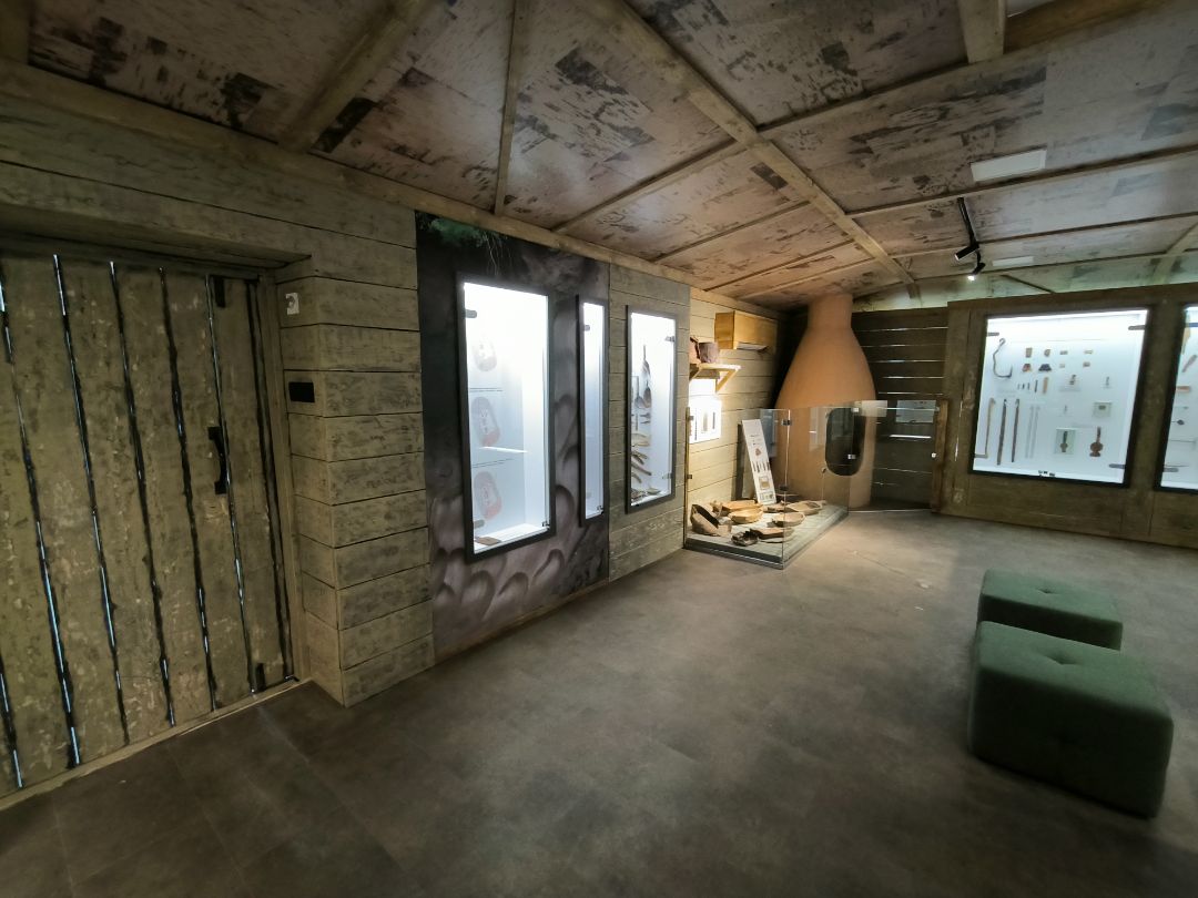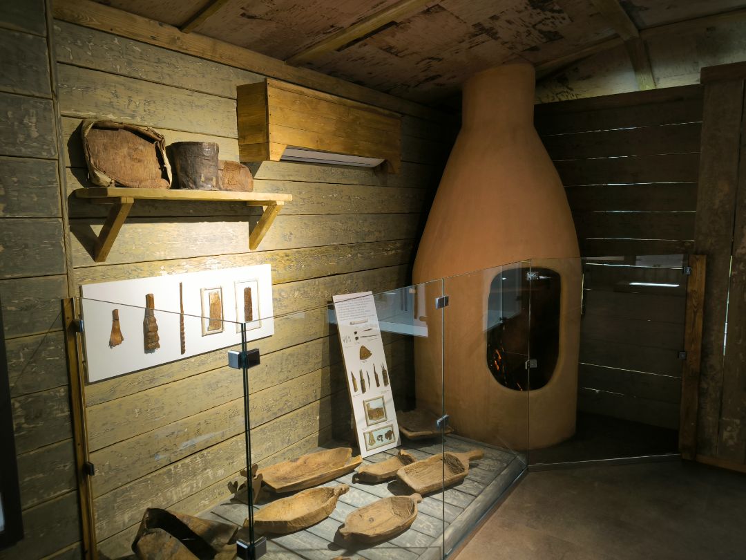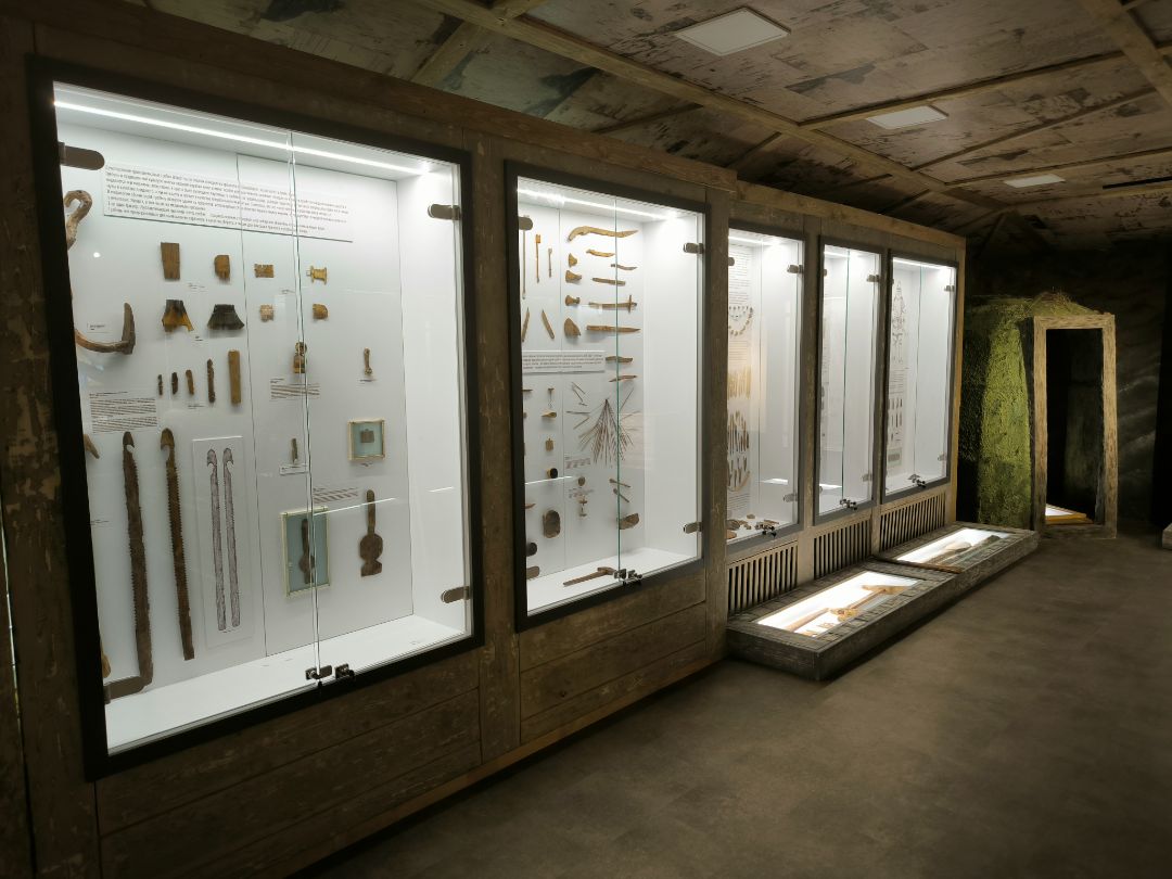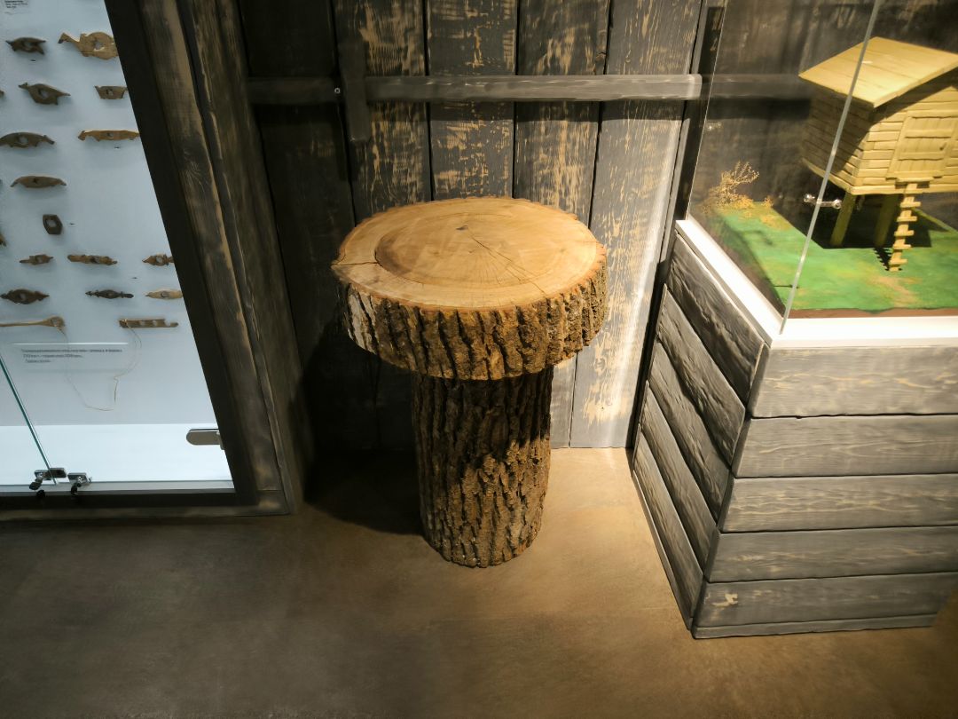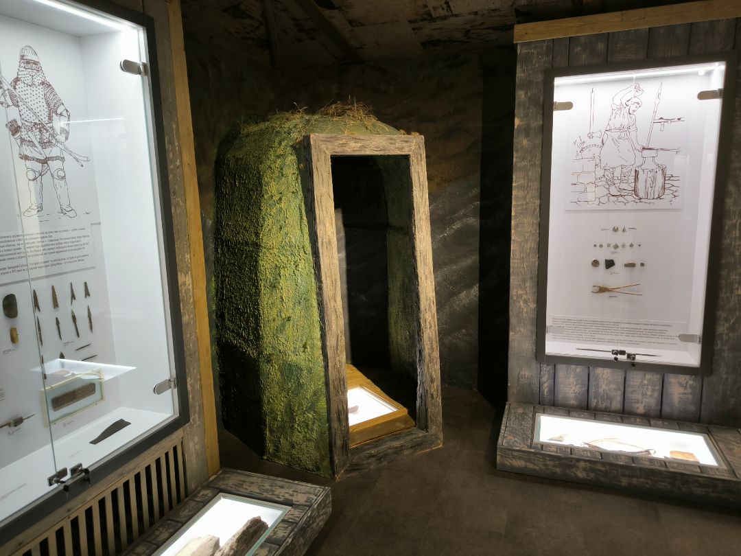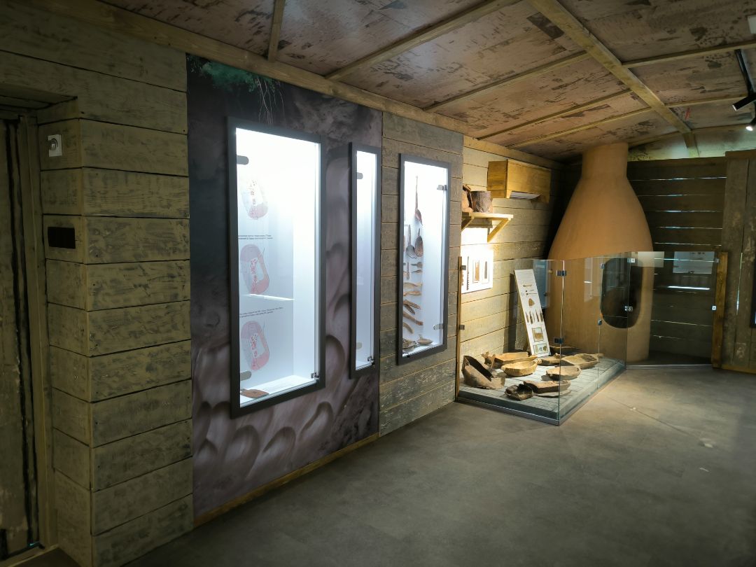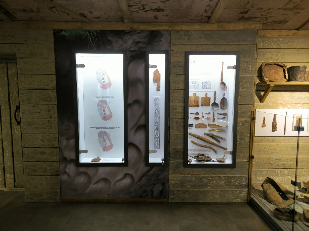 Интерьер экспозиции полностью соответствует стилю эпохи: земляной пол, дощатые стены, берестяной потолок, стилизованный люк в кровле.