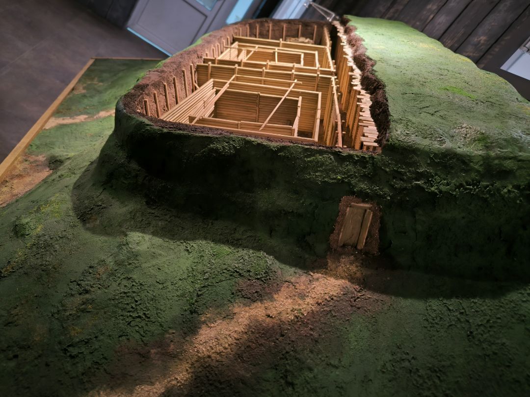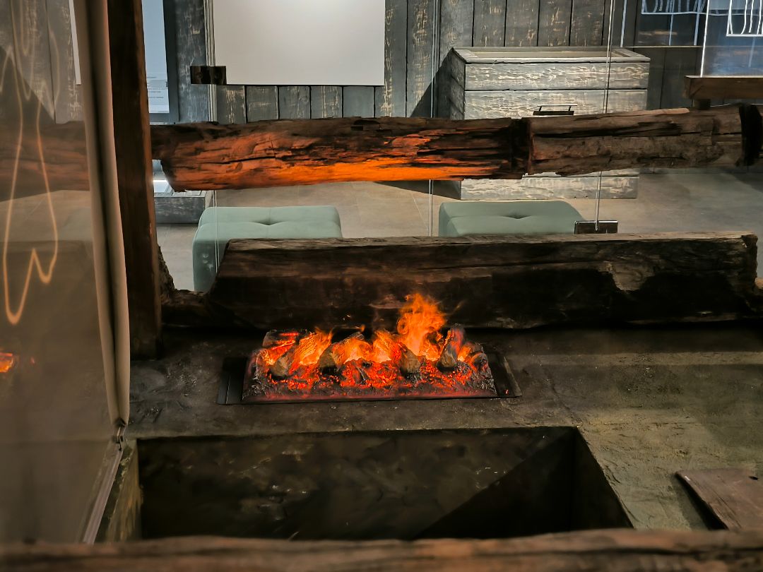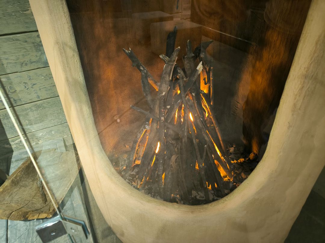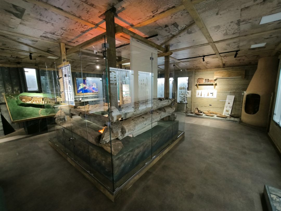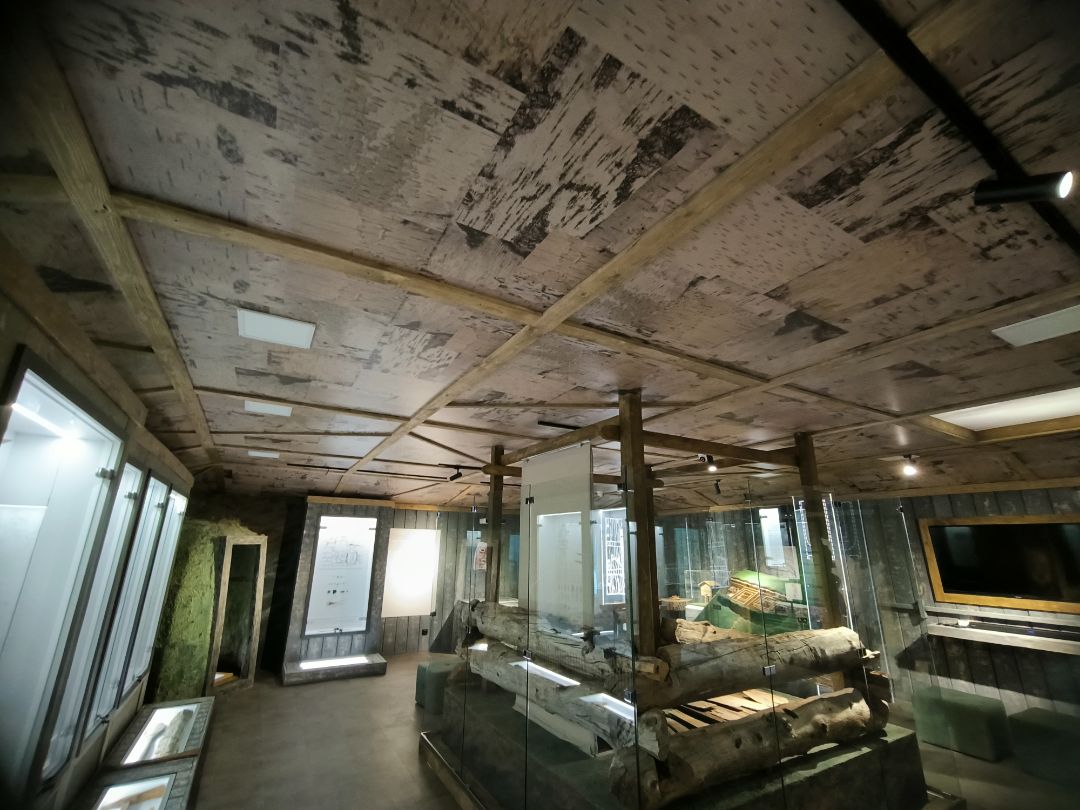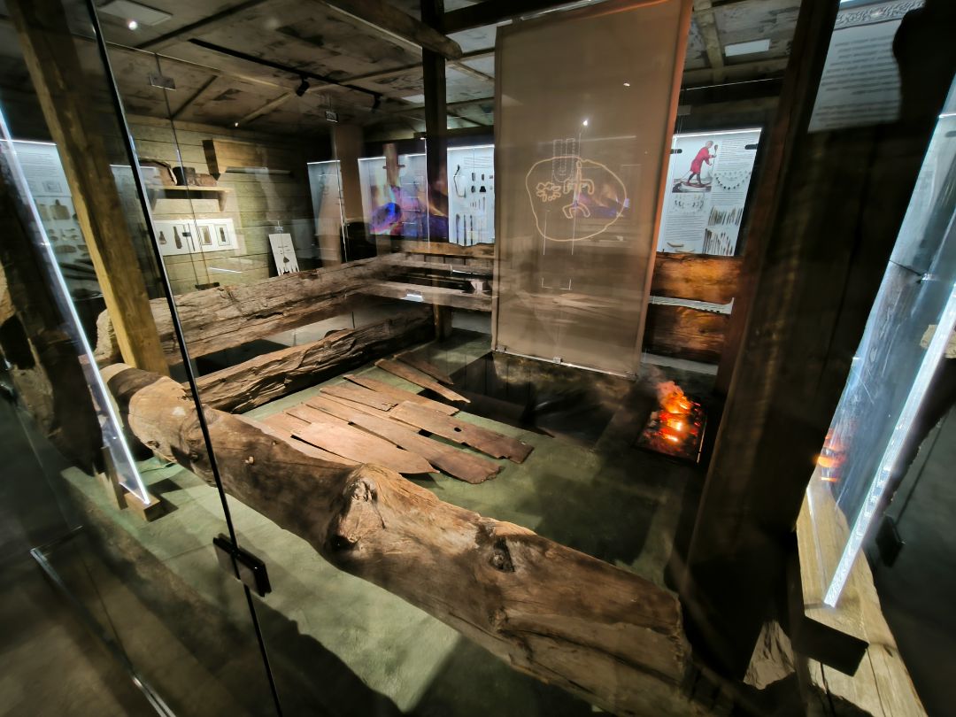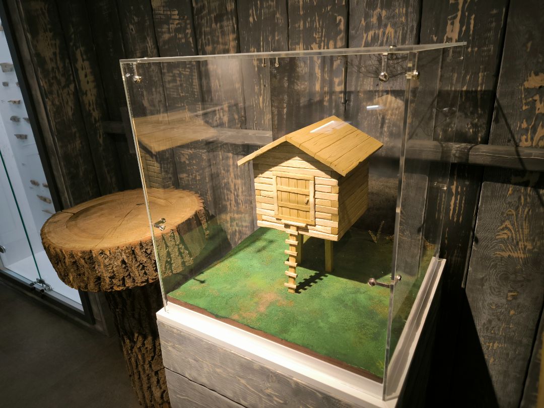 Интерьер экспозиции полностью соответствует стилю эпохи: земляной пол, дощатые стены, берестяной потолок, стилизованный люк в кровле.
