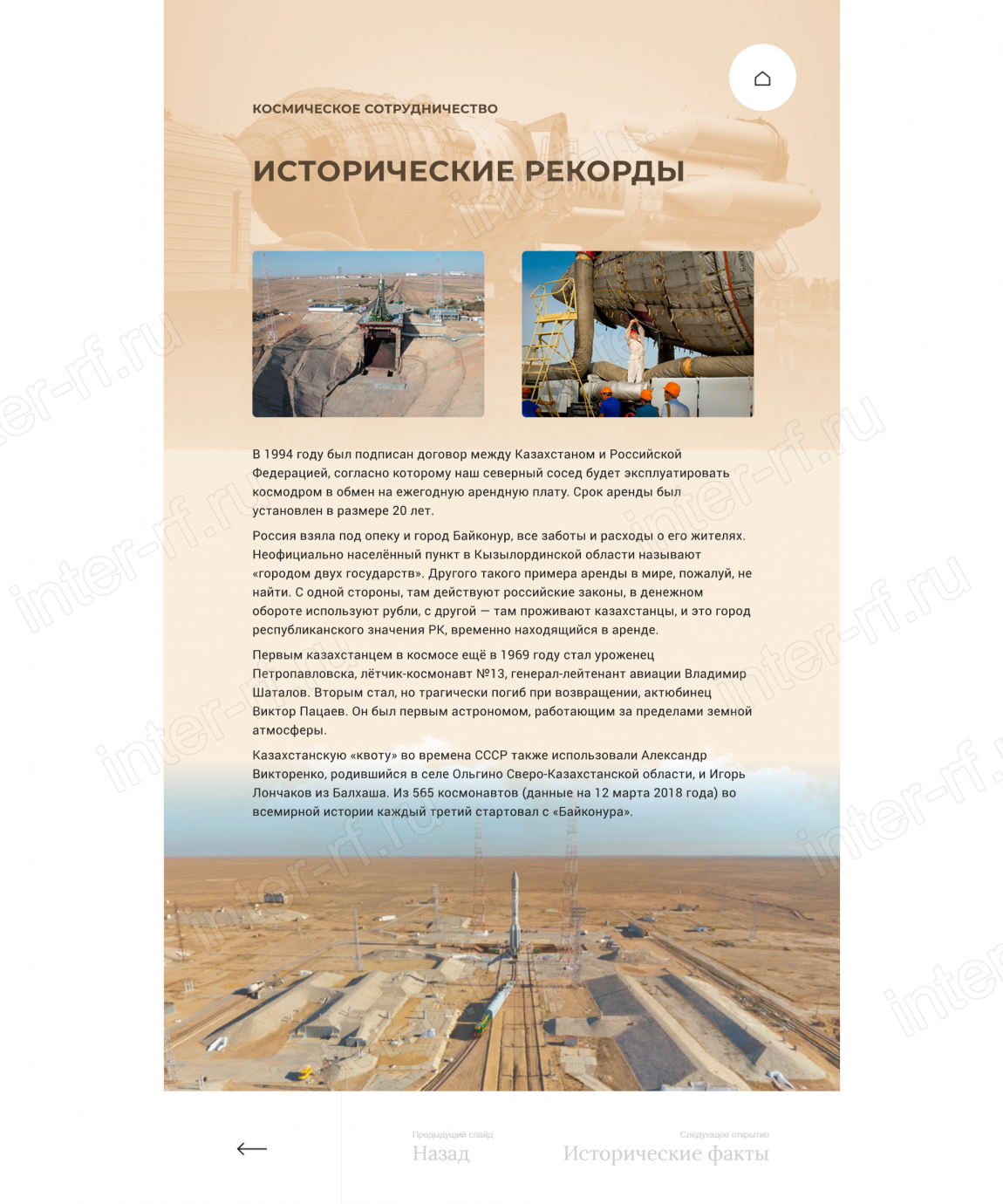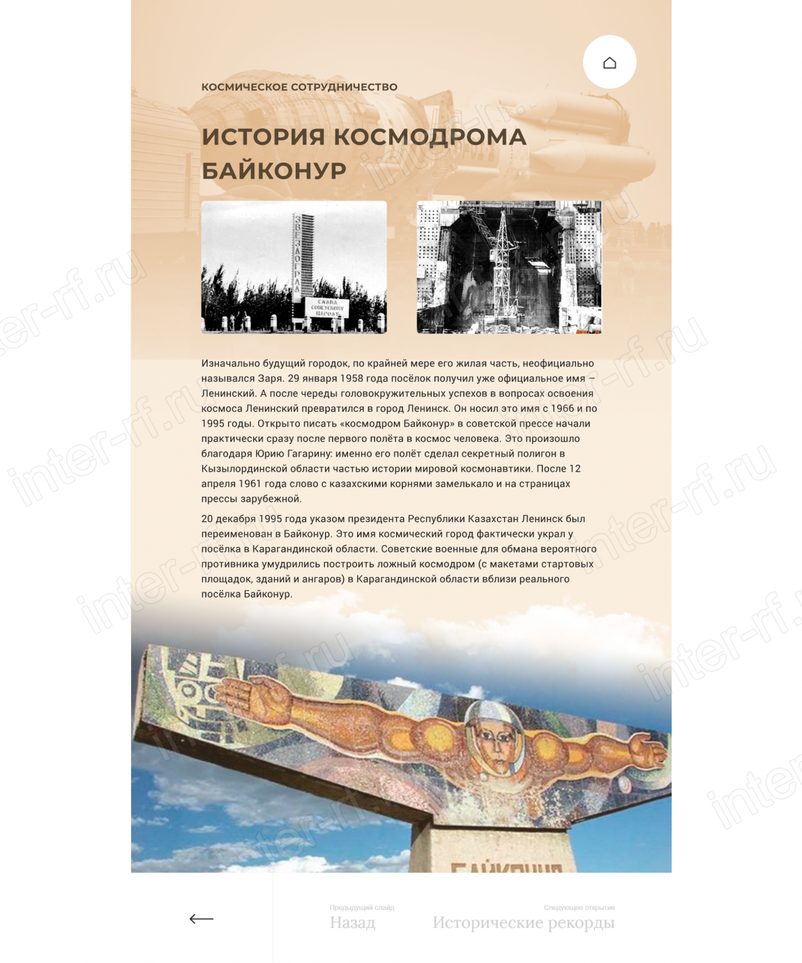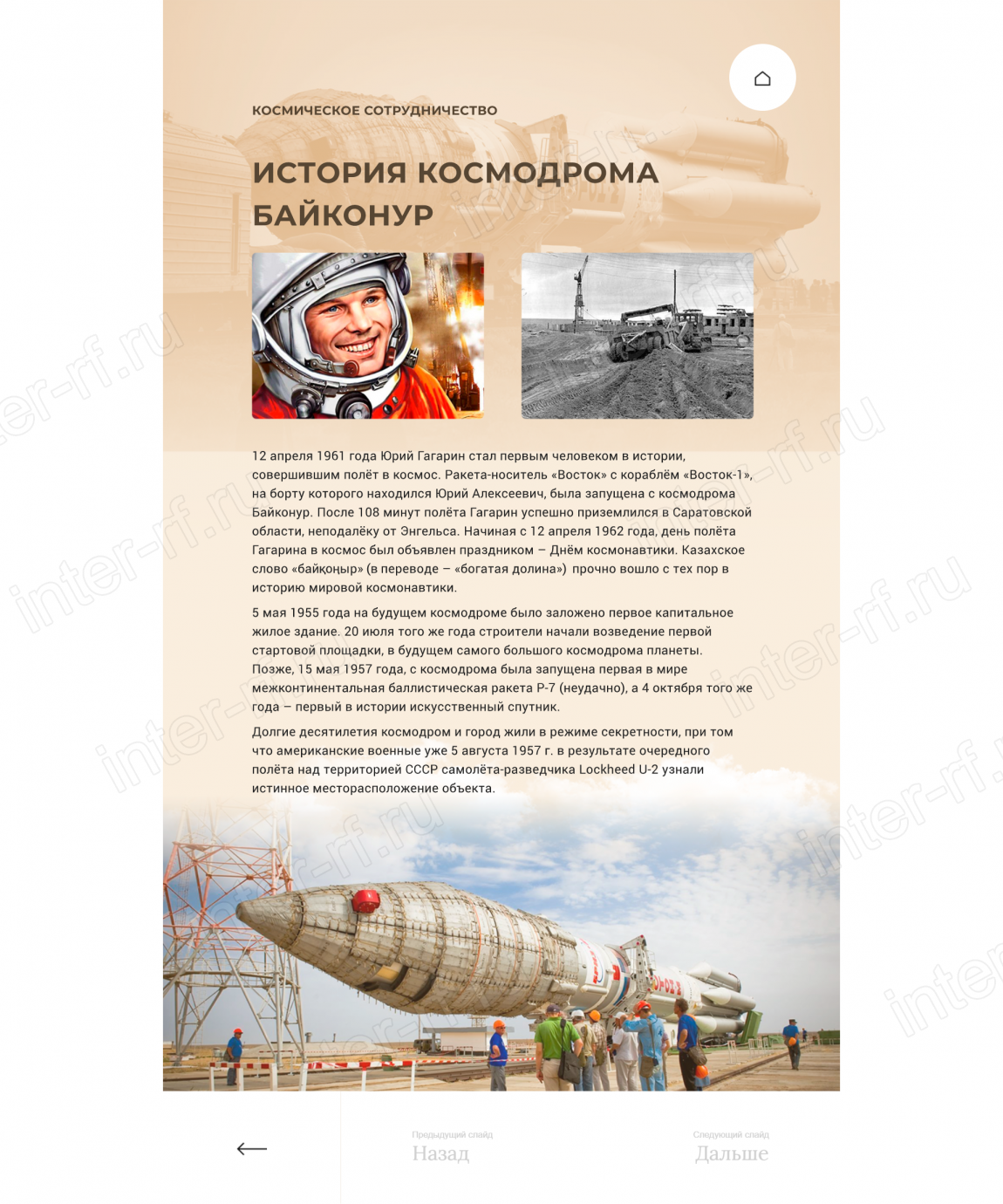 Сбор, анализ и систематизация исходных материалов (исторические справки, архивные фотографии и видеоматериалы, технические данные о космических аппаратах, портреты ключевых фигур) для создания интерактивного контента;