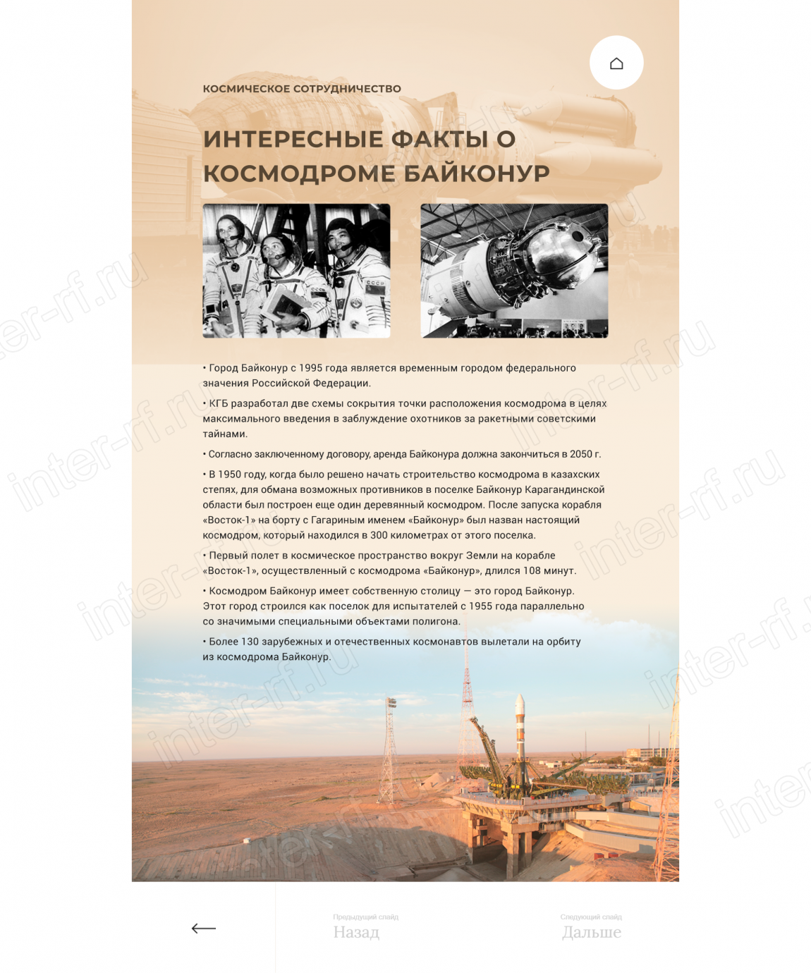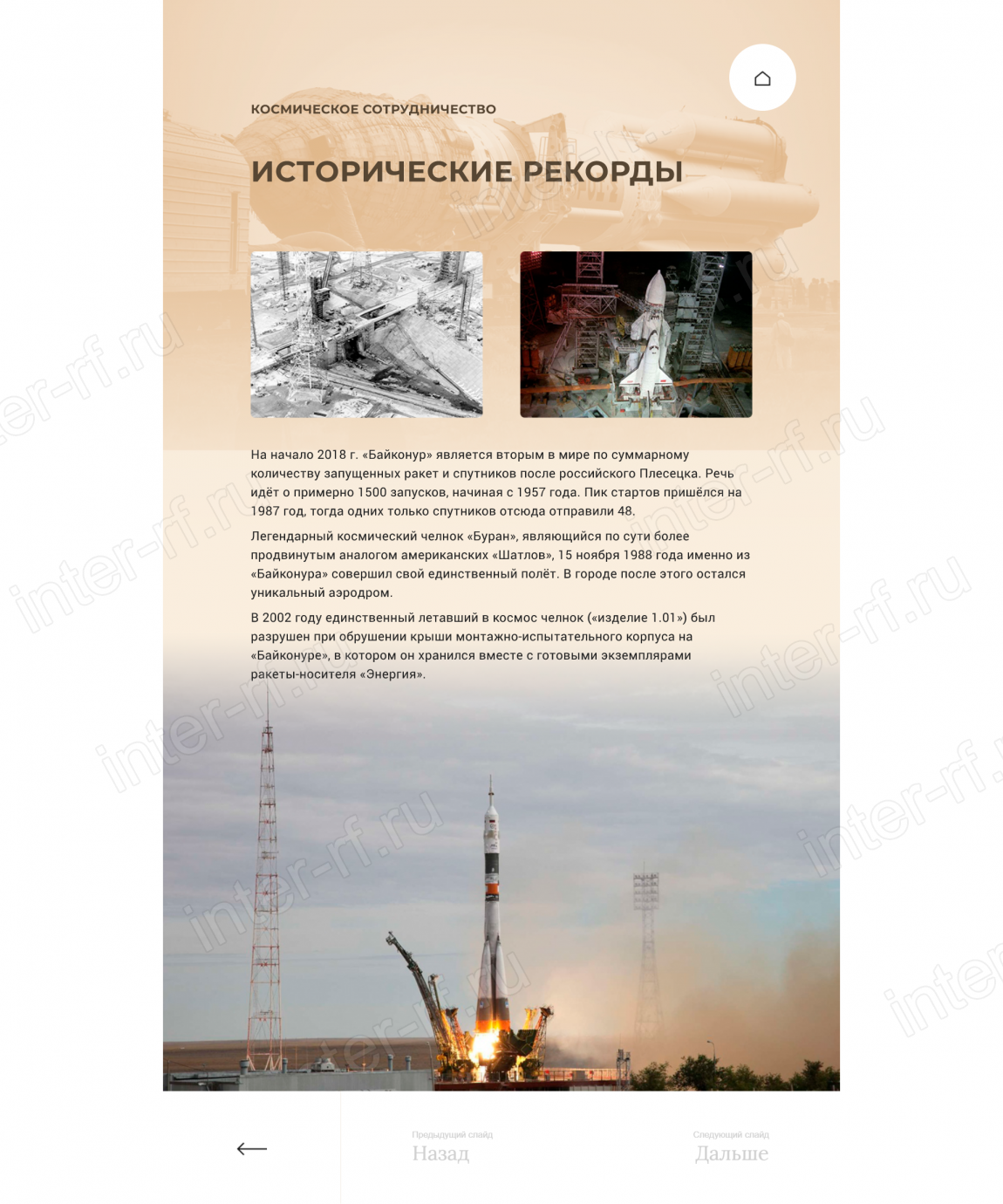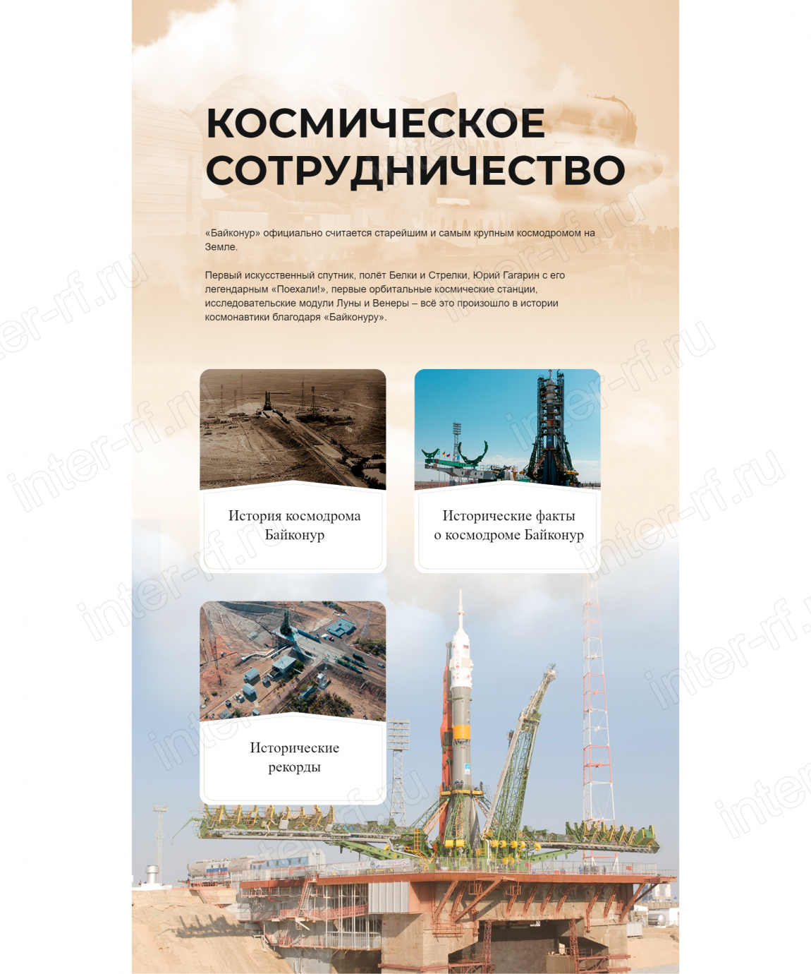 Сбор, анализ и систематизация исходных материалов (исторические справки, архивные фотографии и видеоматериалы, технические данные о космических аппаратах, портреты ключевых фигур) для создания интерактивного контента;