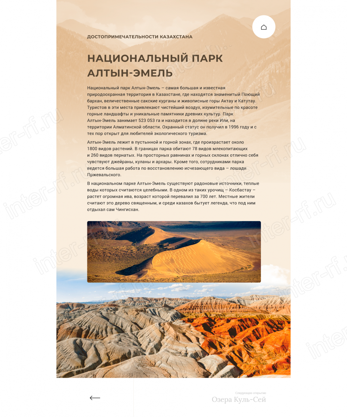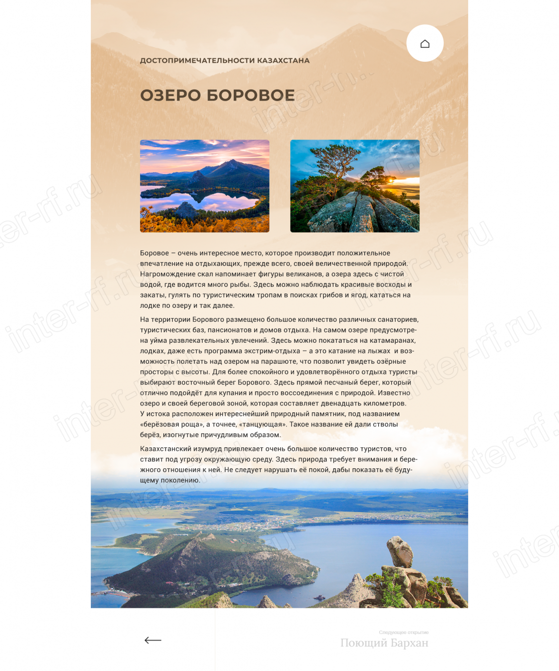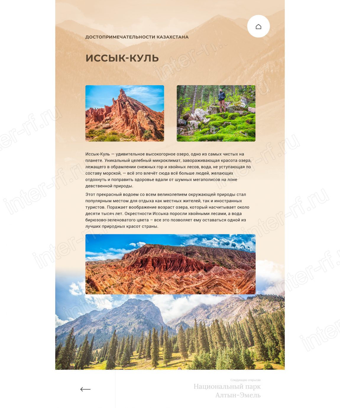 Контент музейного сенсорного терминала представляет собой мультимедийную энциклопедию, посвященную теме «Природа Казахстана». В отличие от статичных стендов, наш формат повествования — научно-популярный, что позволяет удерживать внимание аудитории разного возраста. Информация структурирована с помощью инфографики, ключевых тезисов, профессиональных фотографий и авторских иллюстраций. Такой подход позволяет визуализировать сложные природные явления, ландшафтные зоны и уникальную флору с фауной республики, делая изучение материала наглядным и запоминающимся.