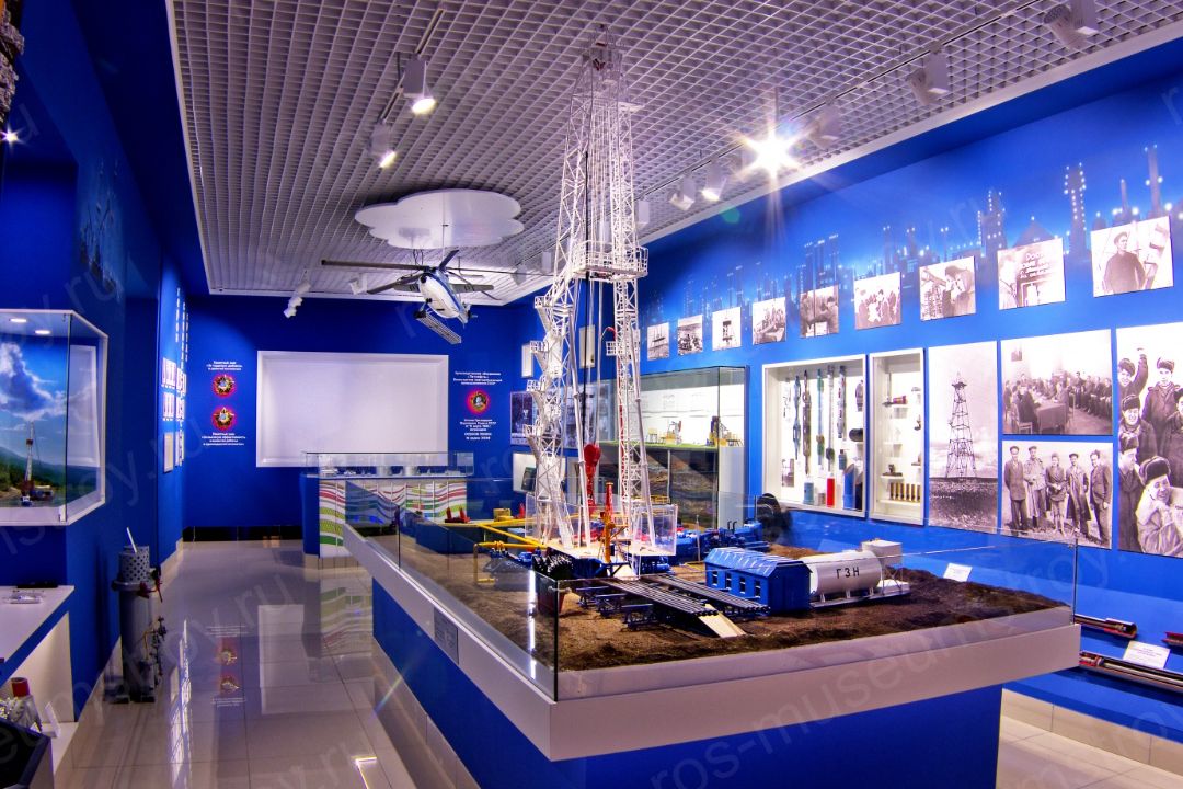 Следующий зал, посвященный пику промышленной добычи нефти выдержан в насыщенном синем цвете. Центральное место в композиции занимает электромеханизированный макет буровой установки. Следующие залы посвящены предприятию в настоящее время, выдержаны в лаконичном современном минимализме.