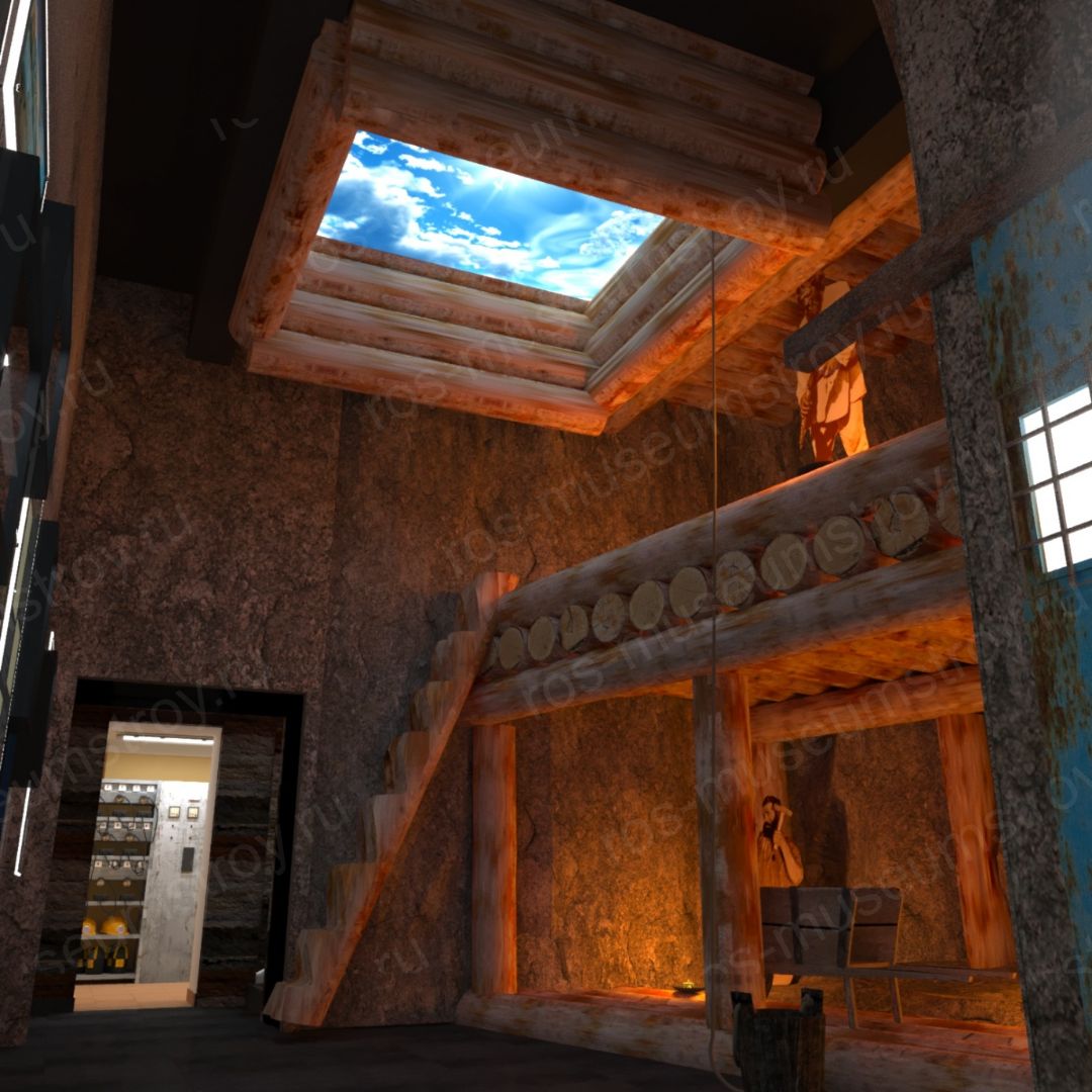 Вход в экспозицию начинается со спуска по лестнице вниз. Помещение декорировано под срез земли. На стенах светящиеся надписи с уровнями шахты: "Горизонт -860" "-950" "-1500" Цоколь, ступени и встроенные перила так же имеют подсветку.
