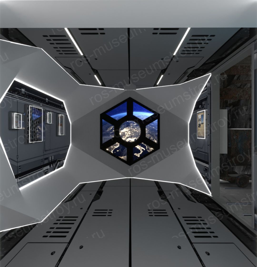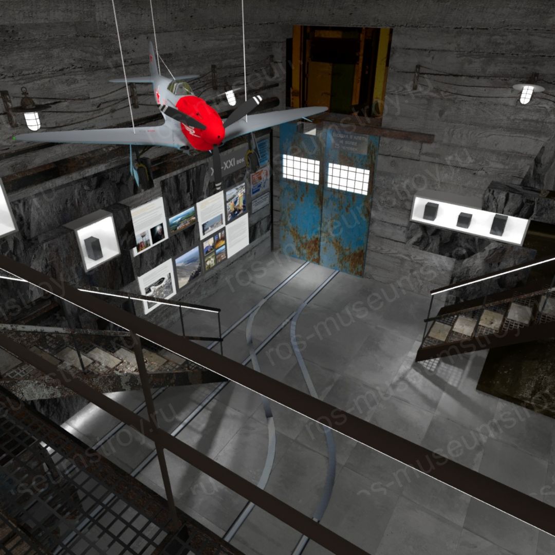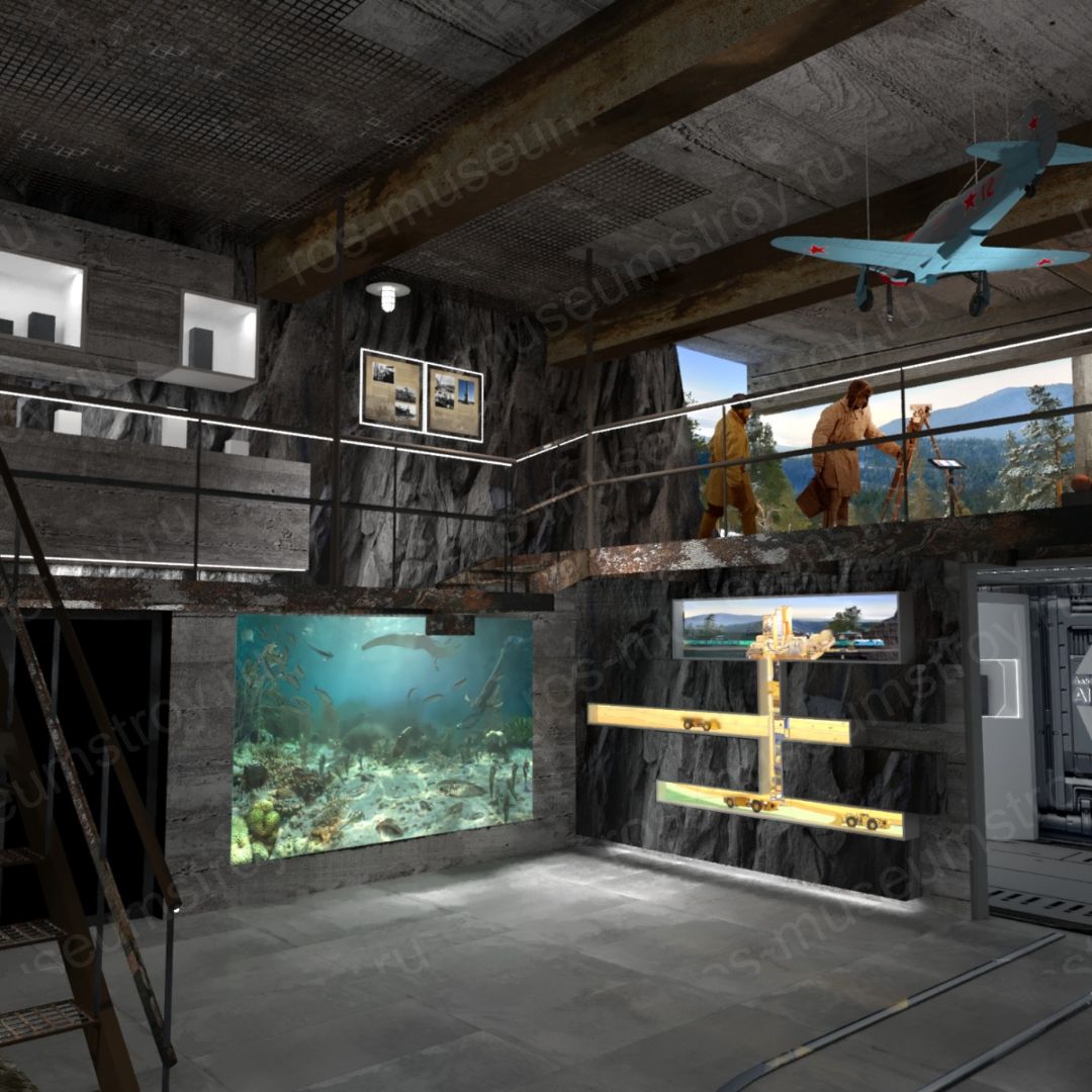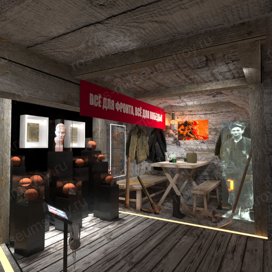 Показаны бытовые условия шахтеров (мебель, посуда, шахтерский фонарь, спецодежда, инструмент, агитация, печка буржуйка) Спереди виртуальный промоутер (экран обратной проекции) Воспроизводится ролик, шахтер цитирует воспоминания времен войны. Зал «Из глубин прошлого - на гора будущего!» Зал напоминает интерьер космической станции. Пол и потолок симметричны. На стенах витрины и сенсорный терминал. На торцевой стене проекционный экран в виде иллюминатора. Стены декорированы фотопечатью с тестурой стен космического корабля и отделаны панелями. Контуры подсвечены. Выход из экспозиции осуществляется по лестнице.