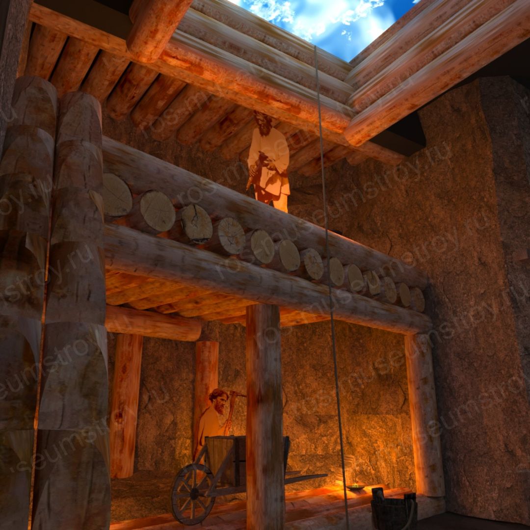 Спустившись вниз посетители попадают в помещение аккумуляторной, где они отмечаются и получают спецодежду, каску, самоспасатель. Далее переходим в зал с инсталляцией "шахта 18 века". Инсталляция показывает условия труда рудокопов прошлого, 3 манекена в разных позах, инструменты, тачка, ведро с веревкой, уходящей к потолку (на поверхность земли) В потолке видно небо. Экспозиция сопровождается звуками работы, голосами, эхом, писком крыс, капающей воды. Противоположная стена оформлена бетонными панелями, в которой встроены витрины, лайтбоксы и сенсорный терминал.