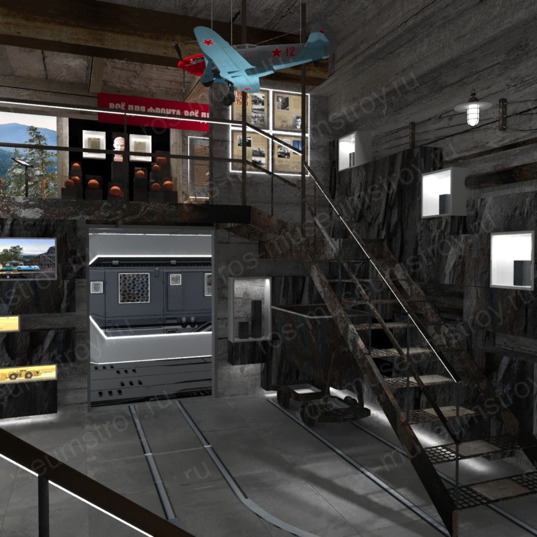 Сетчатая лестница с деревянным настилом по центру ведет на верхний уровень. По периметру встроенные витрины, стенды, на потолке макет боевого самолета времен ВОВ. Наверху показана инсталляция «открытие месторождения» Запечатлен момент открытия месторождения геологами во главе с Н.А. Каржавиным (2 манекена, подсвеченный фон, декоративные покрытия, аудиоэтикетка) Рядом в витринах представлены образцы бокситов, бюст, документы 1930-х. годов. Далее экспозиция переходит к теме Великой отечественной войны.