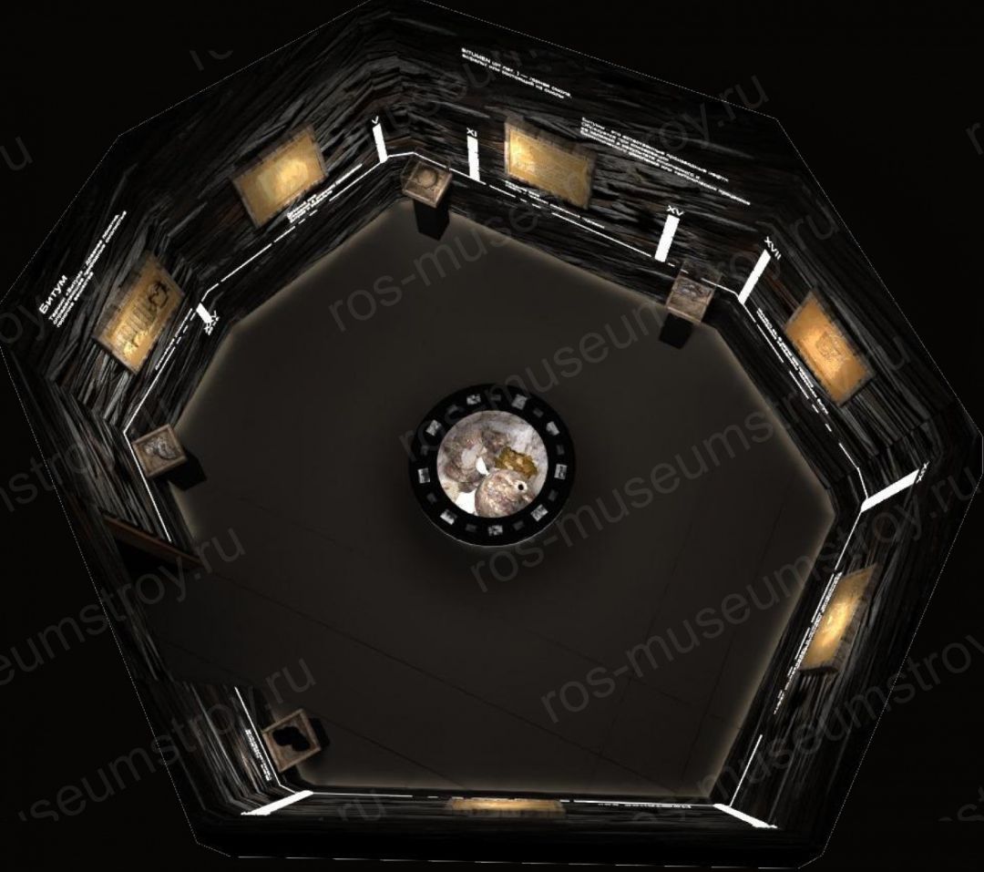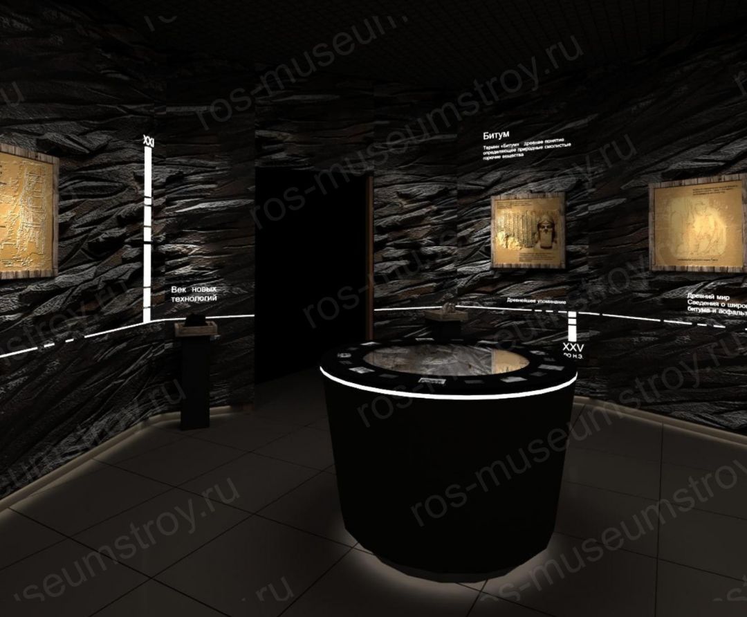 В центре зала находится эксклюзивно изготовленная витрина с "древним артефактом" - амфорой с нефтью. По периметру витрины размещена черно-белая инфографика с сюжетами, посвященными применению нефти в древности.