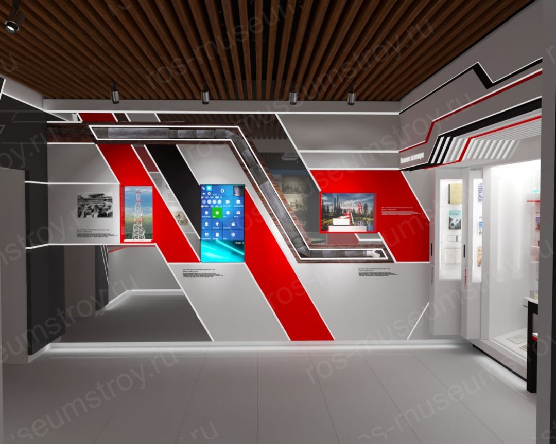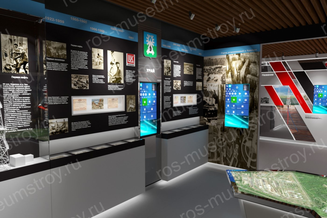 Дизайн-проект корпоративного музея "ЛУКОЙЛ-Урайнефтегаз" выдержан в корпоративных цветах компании- красном, белом и черном. Композиционно дизайн интерьера выдержан в стилистике минимализма, с сочетанием прямоугольных и диагональных элементов. Экспозиция разделена на два основных раздела: - "История предприятия"; - "Предприятие сегодня"; В разделе "история" размещены: макет традиционной избы, в которых жили первые буровики, макет первой буровой установки образца 1960- х гг., экспозиционные стенды, документы и личные вещи ветеранов-основателей предприятия, сенсорные терминалы. В разделе "Предприятие сегодня" размещены: макет "от скважины до потребителя", макет буровой установки БУ-5000 с разрезом пласта и отображением технологии зарезки бокового ствола, макет бура в натуральную величину, механизированный макет станка-качалки, информационные стенды, сенсорные терминалы, химшкаф для проведения экспериментов с нефтью, манекены в униформе работников "Лукойл", натурный образец фонтанной арматуры.