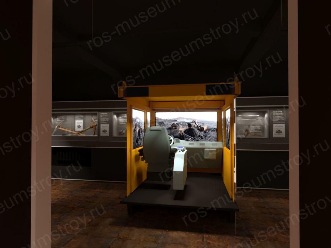 Далее показан интерактивный макет шахты в разрезе (внутри объемной формы расположен экран, на котором показываются подземные работы) сверху надземная часть. Макет карьера с техникой, интерактивный макет гидромонитора, действующие модели современной техники. На экране показывается работа гигантских экскаваторов и самосвалов.
