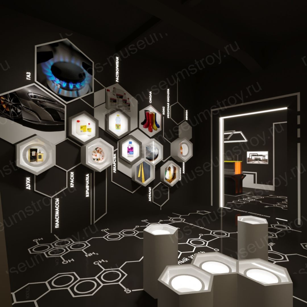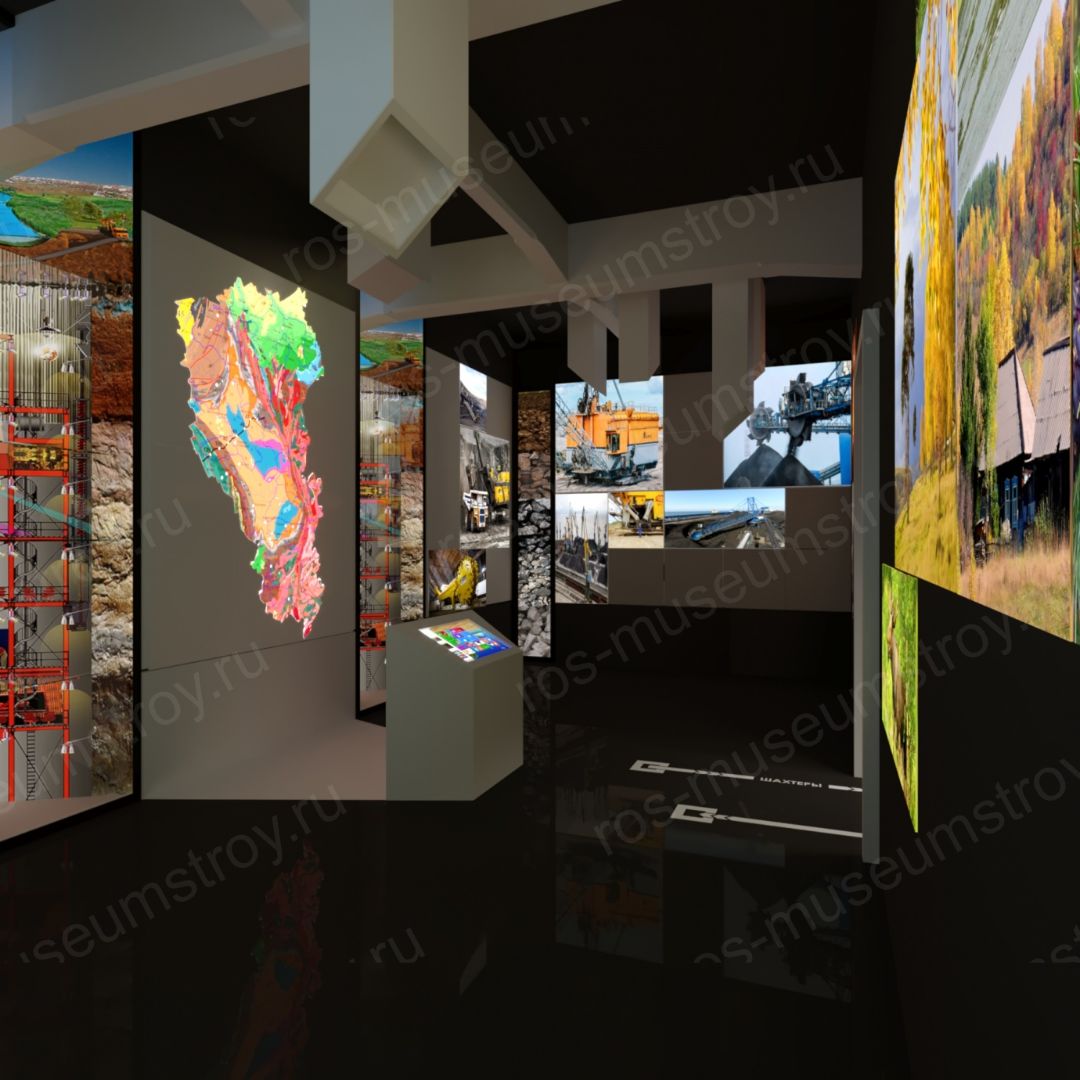 В зале представлены образцы угля, описывается схема получения продукции из угля, показана сама продукция. Информация подается в полиграфическом и интерактивном виде (стенды, сенсорные терминалы, макеты)