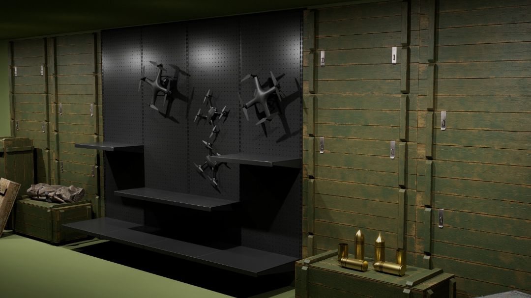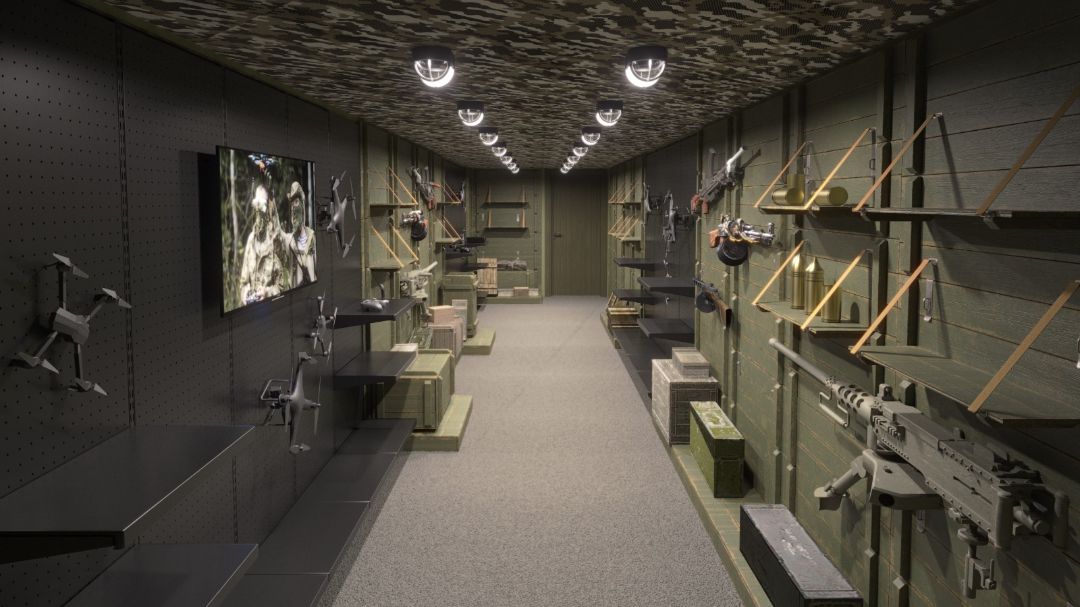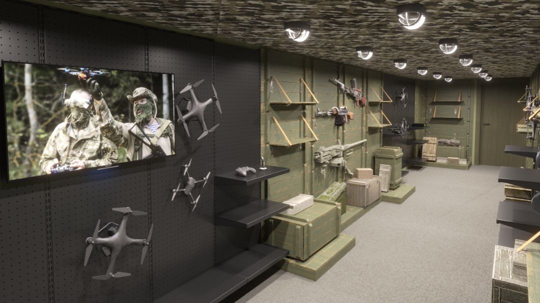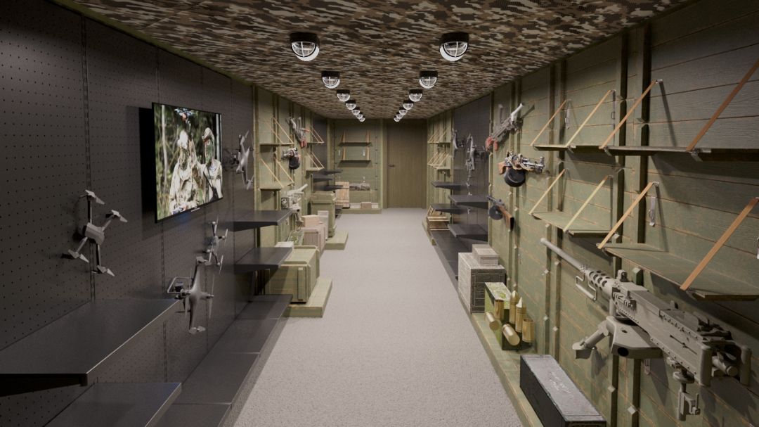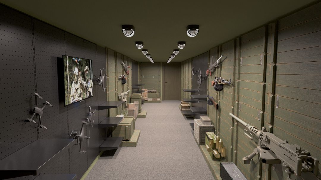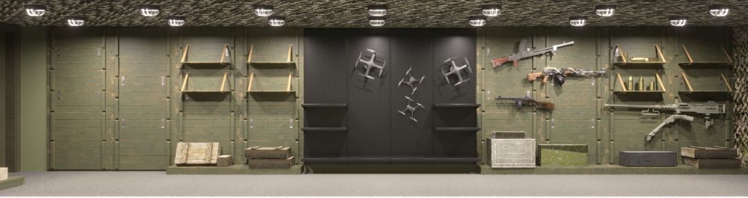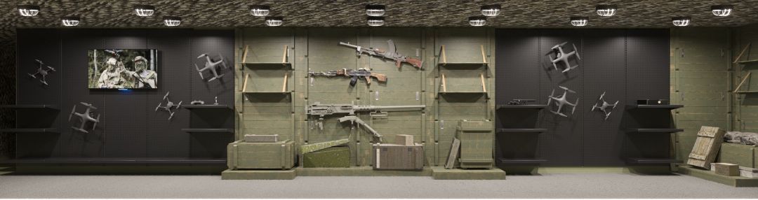 Подиумы и витрины из досок, стилизованные под армейские ящики для боеприпасов — символы надежности и аскетизма. Армейские ящики интегрированы в подиумы, выступая одновременно как основание и часть экспозиции. На них размещены ключевые экспонаты: обмундирование, техника, макеты оружия, дронов и боеприпасов, фотографии.