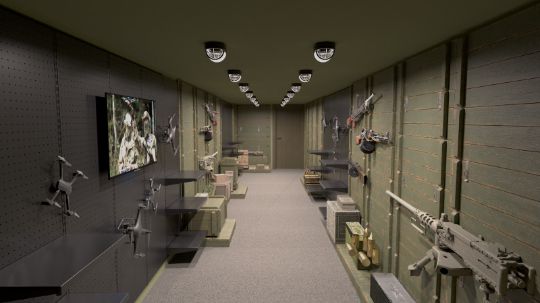 Драматическая световая сцена: приглушенное основное освещение контрастирует с точечной подсветкой экспонатов, создавая эффект «прожекторов истории», которые выводят из тени важные детали. Под потолком натянута маскировочная сеть, чьи тени динамично проецируются на стены, усиливая ощущение напряженности.
