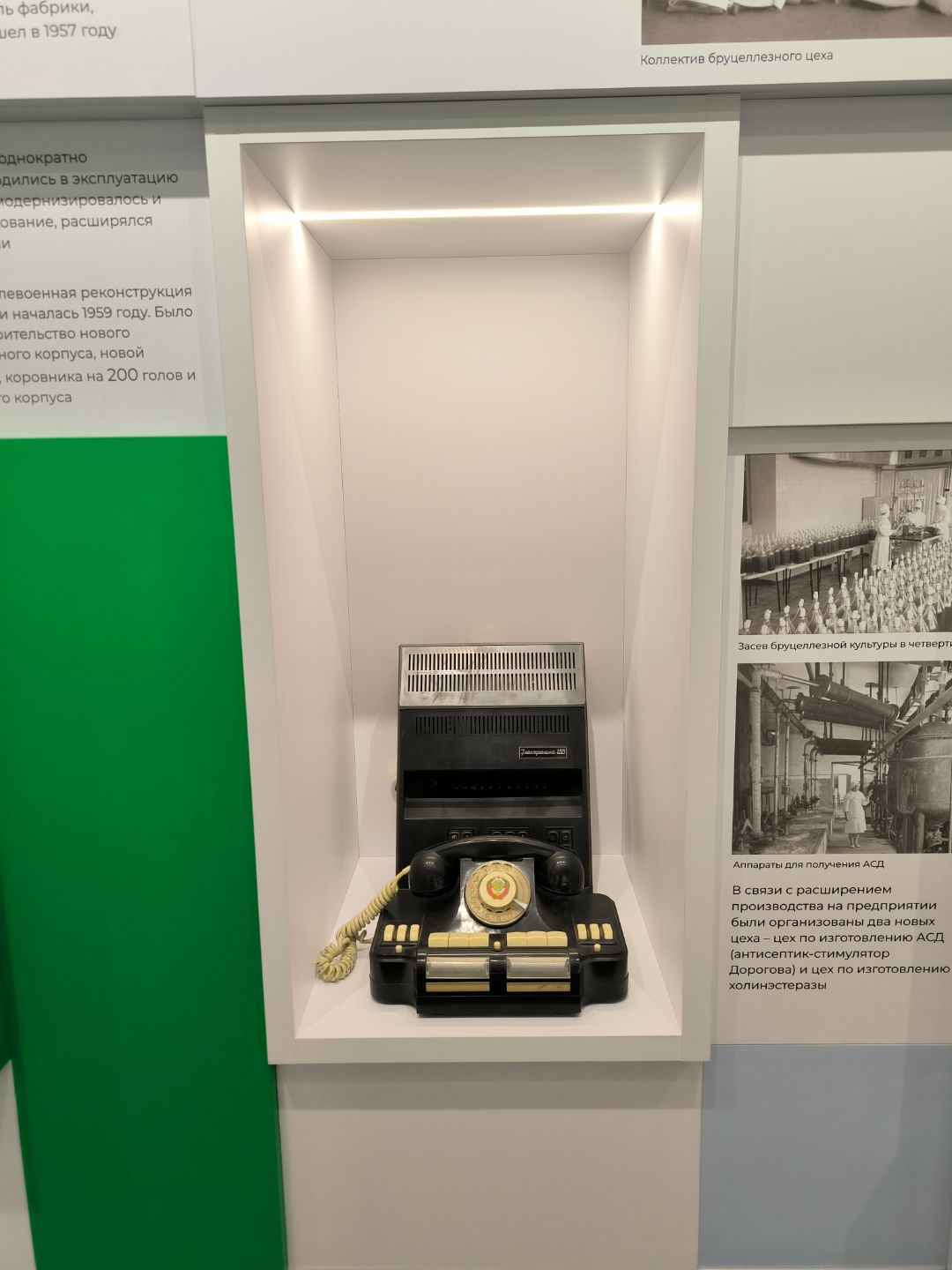 Одну из стен музея занимает экспозиционный стенд – своеобразный таймлайн истории предприятия. Здесь показаны развитие, достижения и награды предприятия – на стенде и его полках-нишах размещены фото и текстовые материалы, макет здания усадьбы, с которого началась история предприятия, образцы оборудования, кубки, интерактивный ретро телефон.