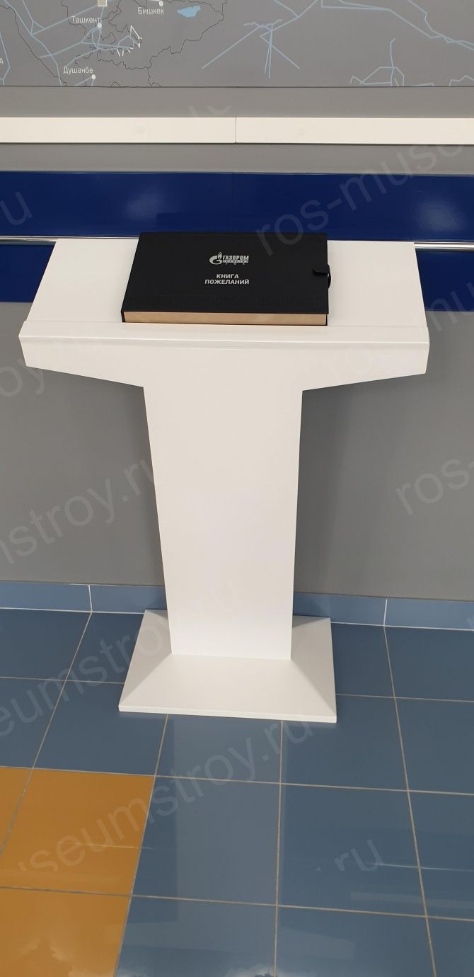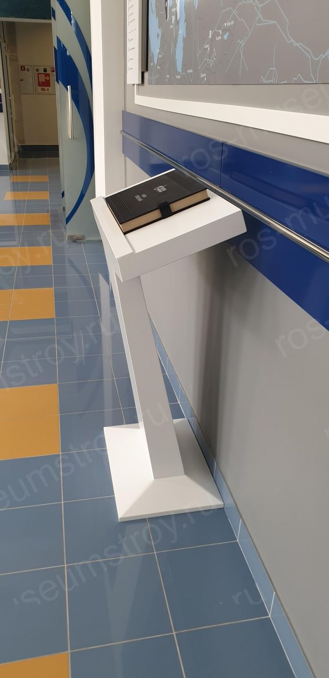 Электронная книга отзывов выполнена из МДФ выкрашенного в белый полуматовый цвет. В специально изготовленном корпусе в виде книги размещена сенсорная панель диагональю 12 дюймов. Записи в электронную книгу отзывов производятся при помощи стилуса.
