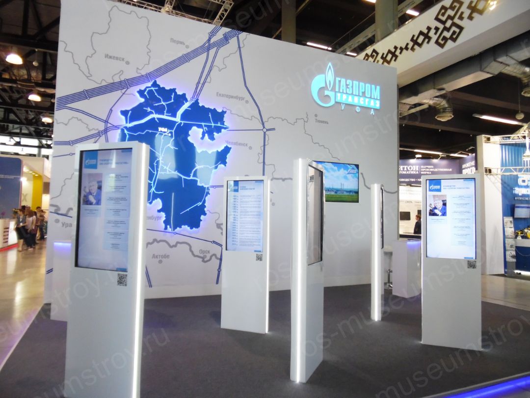 Первостепенная задача стенда – представление компании «Газпром трансгаз Уфа» как одной из лидирующих нефтегазовых компаний в республике Башкортостан. Основу экспозиции составили 5 стел с мультимедийными экранами 42 дюйма, выполненные по индивидуальному дизайну. Пожелания по интерактивному наполнению обговаривались с Заказчиком индивидуально на этапе разработки проекта. Тематикой наполнения интерактивных сенсорных терминалов явились производство, экологическая и социальная политика компании «Газпром». Оформление технического оборудования, его габаритные размеры и цветовое решение были выполнены в соответствии с эскизом дизайн-проекта, полностью отвечающим задачам Заказчика.