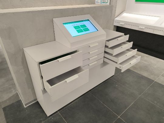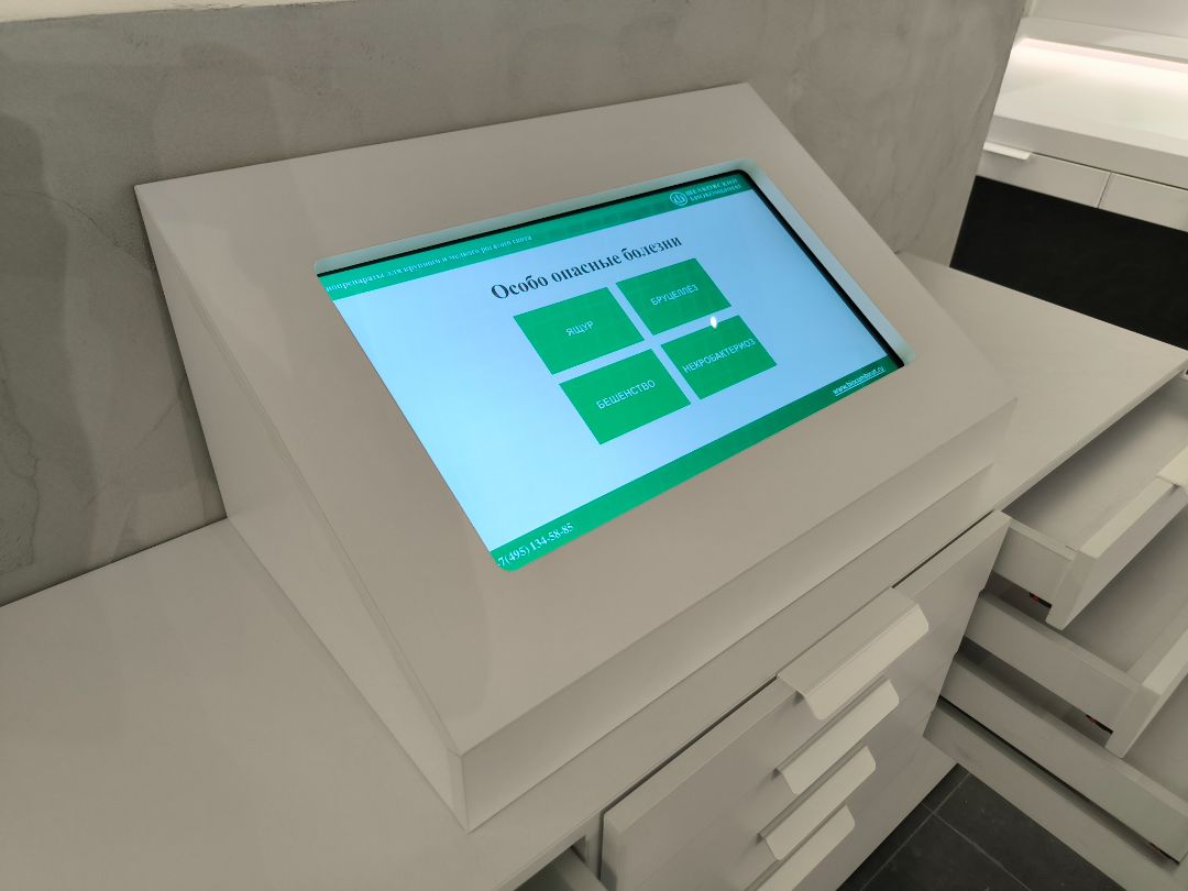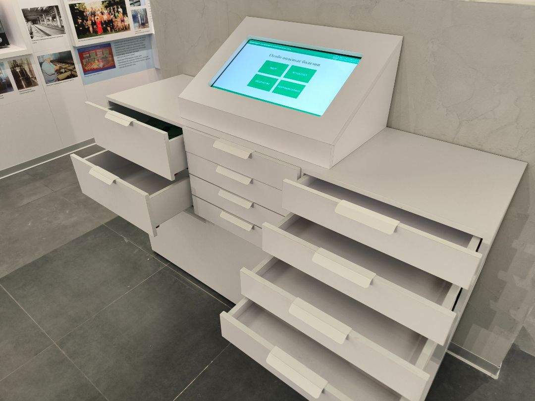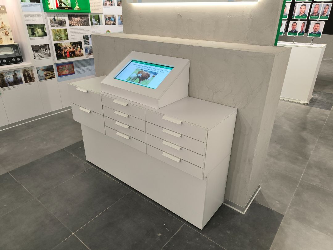 Наша команда изготовила интерактивную тумбу для Музейно-образовательного комплекса «Щёлковского биокомбината» в Лосино-Петровском. Тумба имеет интерактивный экран со встроенным контентом от заказчика. В самой тумбе имеются выдвижные ящики разных размеров, что очень удобно и практично.