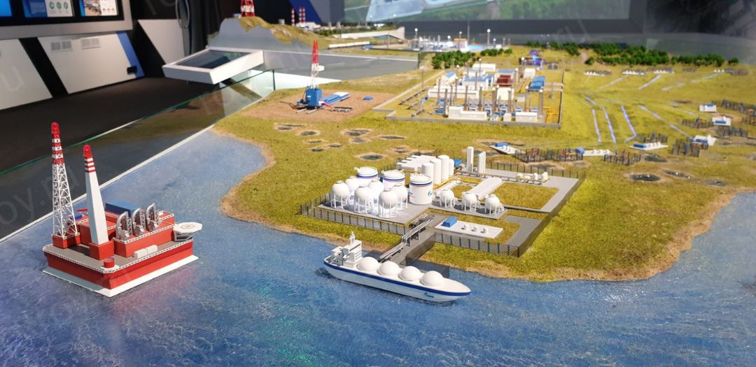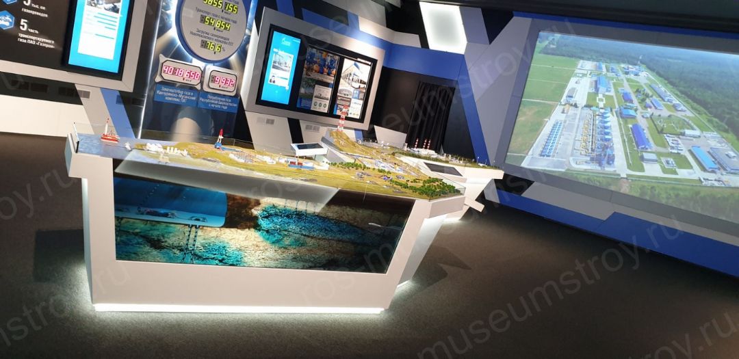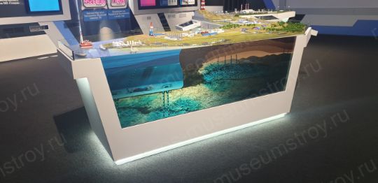 В районе морской добычи на вертикальную стенку подиума проектором транслируется изображение среза грунта и воды с анимацией добычи газа на шельфе.