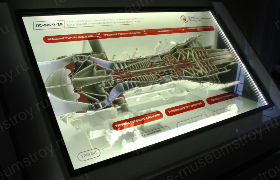 Прозрачный LCD-дисплей с функцией интерактивного взаимодействия (татч-скрин) установлен в плоскость разреза ГТД и предполагает воспроизведение мультимедийного контента, демонстрирующего процессы работы двигателя, а также выделение его основных элементов.