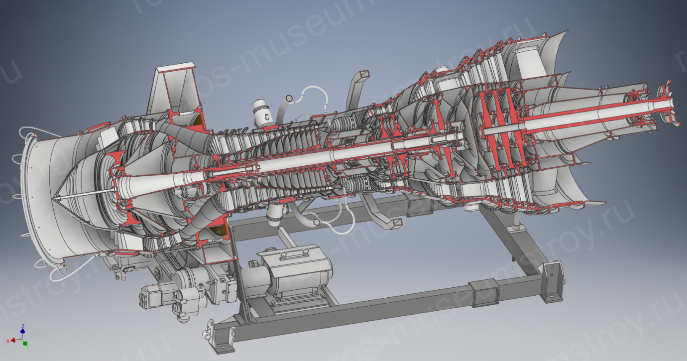 В макете предусмотрен продольный разрез с высокой детализацией проработки внутренних узлов ГТД для наглядности отображения внутренней конструкции двигателя.