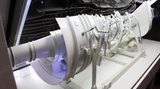 Интерактивный макет газотурбинного двигателя ПС-90 представляет собой модель двигателя, выполненную из пластика в масштабе 1:4 с вырезом 1/2 корпуса. Перед макетом размещена наклонная прозрачная жк панель с возможностью сенсорного управления.