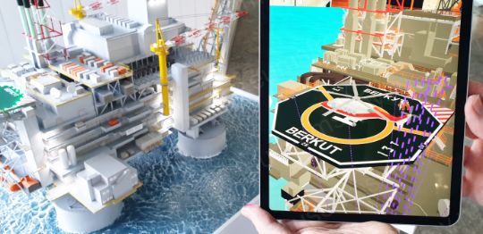 С помощью айпада посетители выставочного стенда могли совершить виртуальную экскурсию по платформе, ознакомится с анимацией процессов от погрузки труб с корабля снабжения, до процесса одновременного бурения, добычи и разделения нефти и газа.