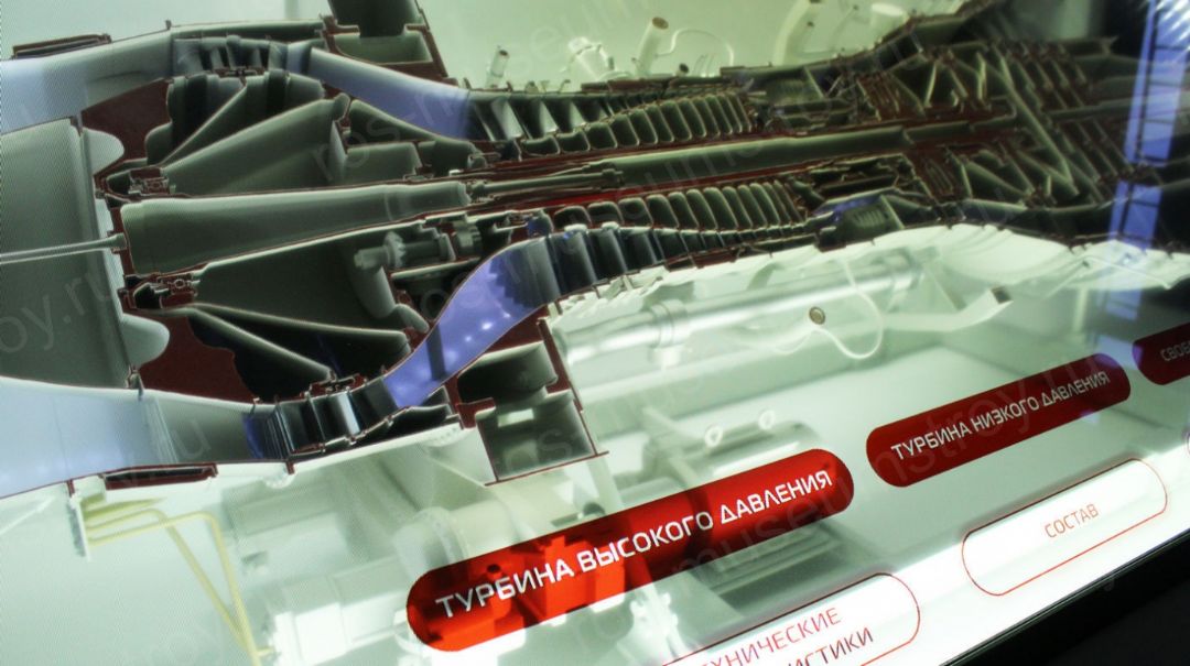 Прозрачный LCD-дисплей с функцией интерактивного взаимодействия (тач-скрин) установлен в плоскость разреза ГТД и предполагает воспроизведение мультимедийного контента, демонстрирующего процессы работы двигателя, а также выделение его основных элементов.