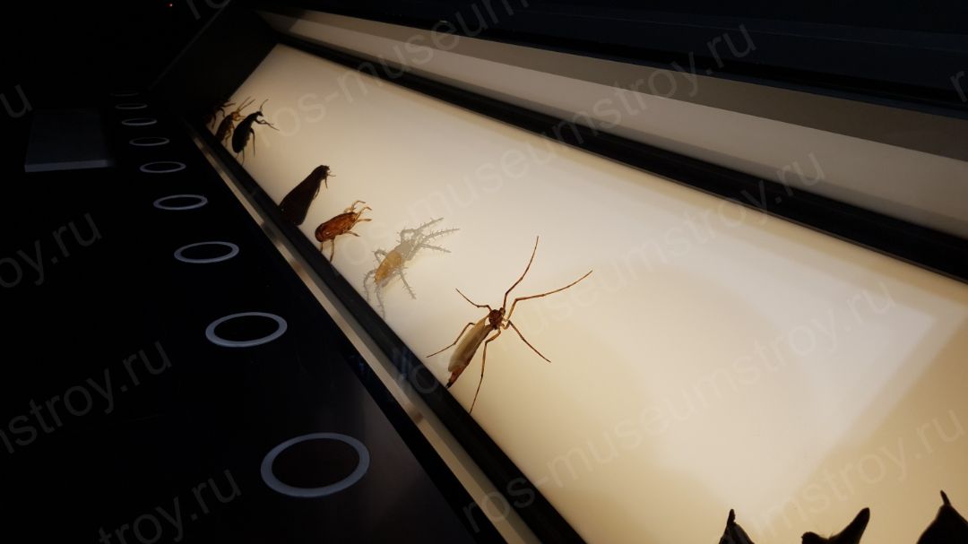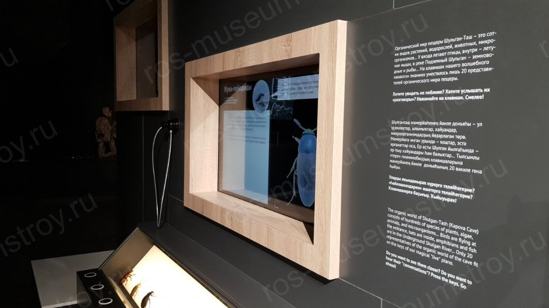 Напротив световой панели с изображениями размещены сенсорные кнопки. При нажатии на определённую кнопку, напротив представителя животного или растительного мира, на мониторе появляется фото/видео изображение, записи звуков насекомых, инфографика.