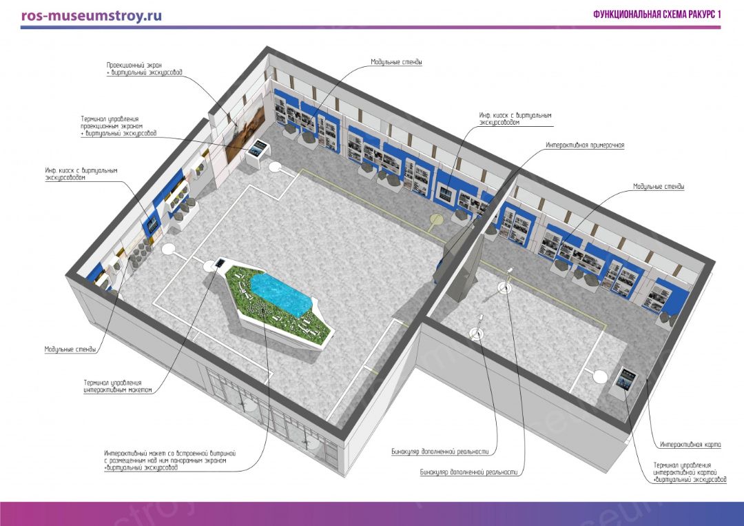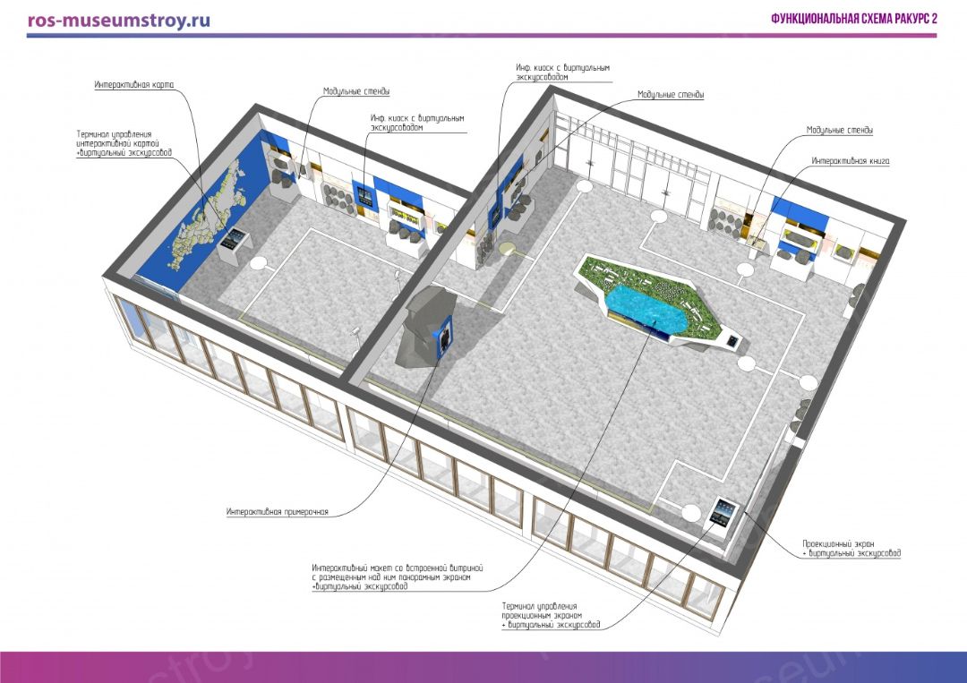 - интерактивный макет с встроенными витринами и панорамным экраном над ним;