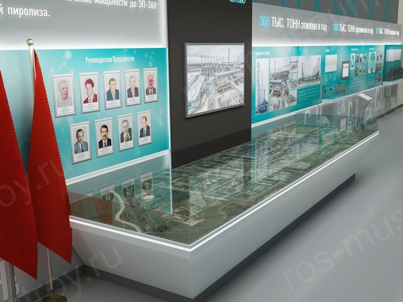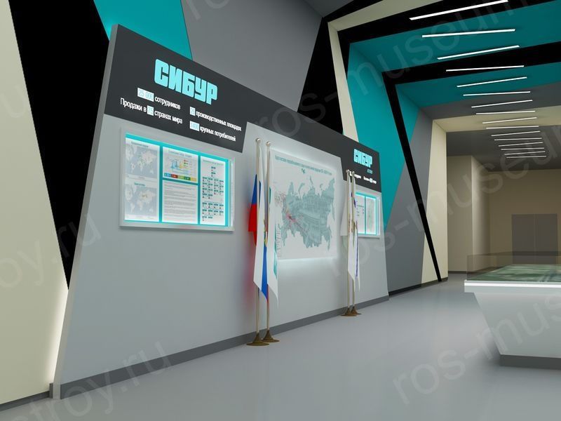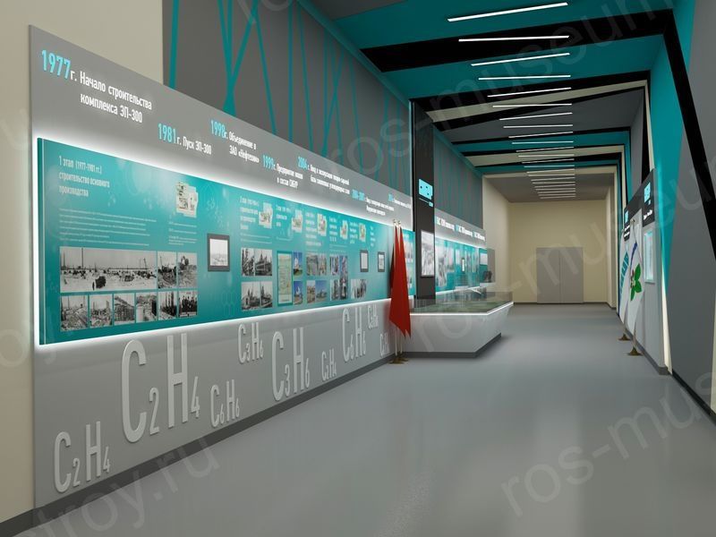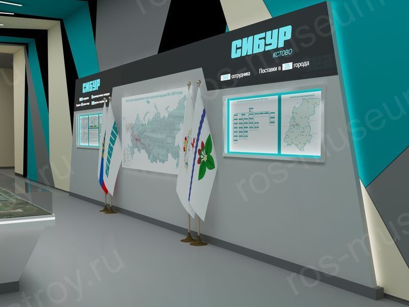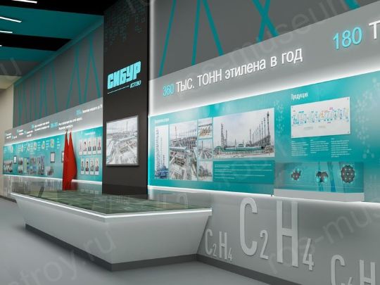 Дизайн-проект корпоративного музея ООО «СИБУР-Кстово», разработанный нашими ведущими специалистами, отвечает всем требованиям современной музейной экспозиции.