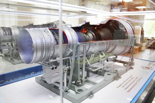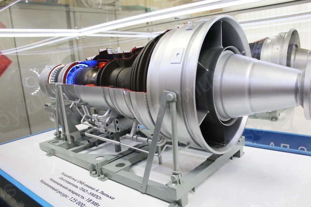 Интерактивный макет представляет собой модель газотурбинного двигателя Ал-31 СТ, выполненную в масштабе 1:5, с вырезом 1/4 корпуса. Макет имеет возможность вращения турбин, светодинамическую подсветку турбины.