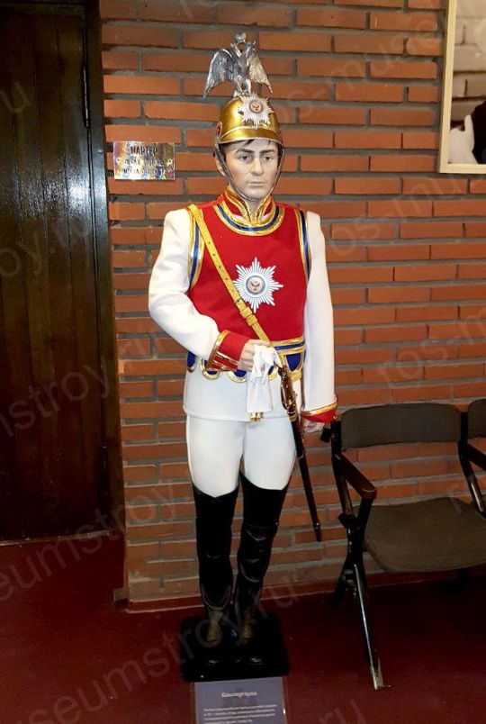 Экспозиция состоит из двух манекенов. «Возраст» манекенов – 20-25 лет. Кавалергарды— гвардейская тяжелая кавалерия Российской Империи. Поза стоя «смирно». Осанка прямая. В правой руке держит палаш. Левая опущена вниз. Для манекенов пошита на Заказ дворцовая парадная форма. Мундир (колет) белый. Поверх мундира надевалась кираса-супервест из красного сукна со звездой , а на ноги — белые лосины. ботфорты. Каска золотая с серебряным орлом , перчатки с крагами белые. Волосы русого цвета на висках и затылке выглядывают из-под шлема. Усы.
