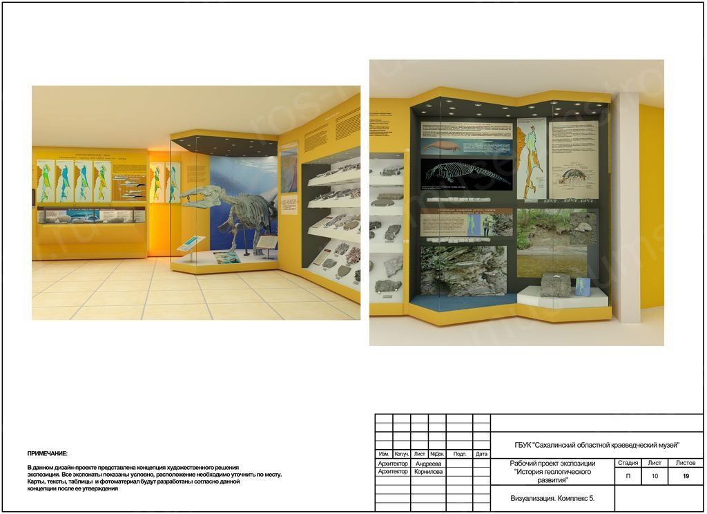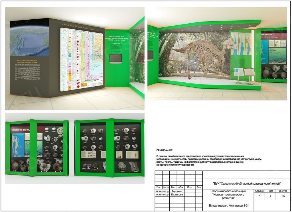 Дизайн-проект, разработанный специально для Сахалинского краеведческого музея, представляет собой масштабную и реалистичную музейную экспозицию «История геологического развития». При создании каждого проекта важны даже самые мелкие детали, именно поэтому каждый элемент экспозиции обговаривается и согласовывается с Заказчиком. Вот и в данном проекте наши специалисты представили на утверждение Заказчику концепцию художественного решения экспозиции, где условно показали место расположения каждого экспоната. Все карты, тексты, таблицы и фотоматериал были разработаны нашими специалистами согласно утвержденному дизайн-проекту.