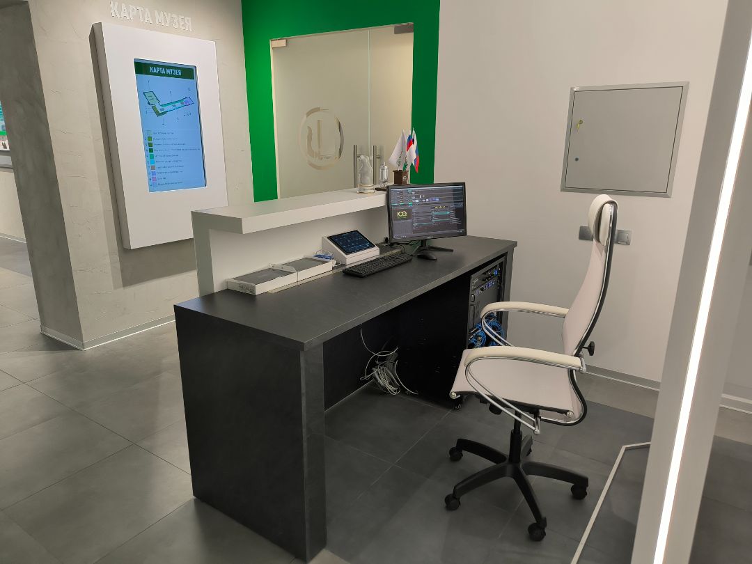 Это полноценное рабочее место, расположенное на входе в зал музея у зоны принятия гостей.
