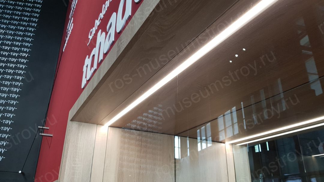 Встроенные витрины декорируются встроенной подсветкой, что привлекает внимание к экспонатам и создает уютную атмосферу.