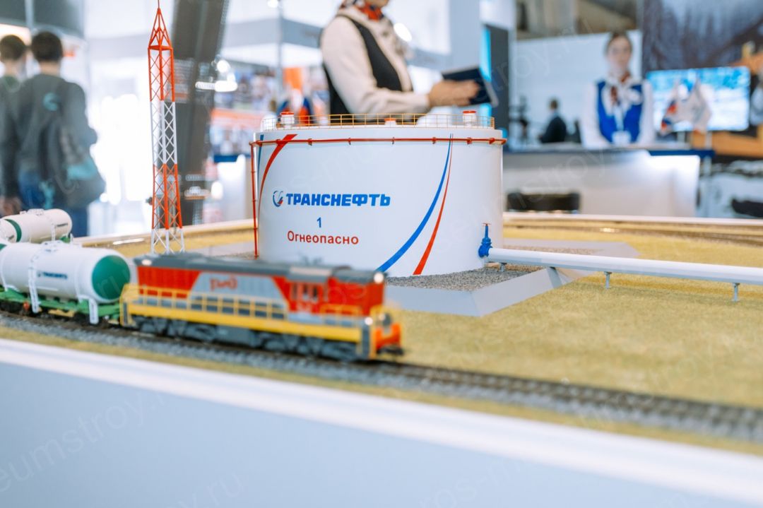 Еще один интересный экспонат-витрина с образцами нефтепродуктов, стилизованная в виде железнодорожной цистерны, брендированной в соответствии с корпоративным стилем ПАО «Транснефть»