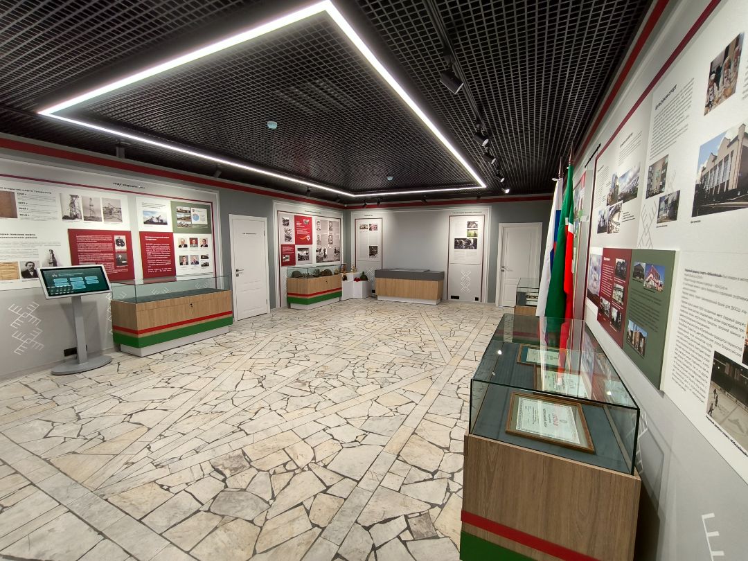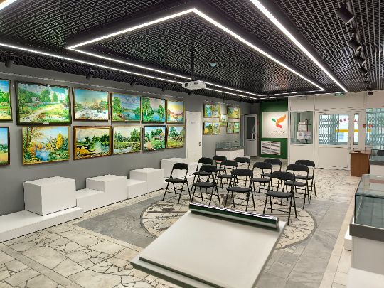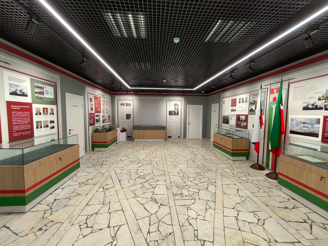 Этнокультурный акцент: Декоративные элементы с татарским орнаментом тонко интегрированы в дизайн стен и отделки, подчеркивая уникальное культурное наследие региона и создавая узнаваемый образ музея.