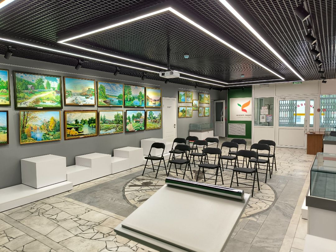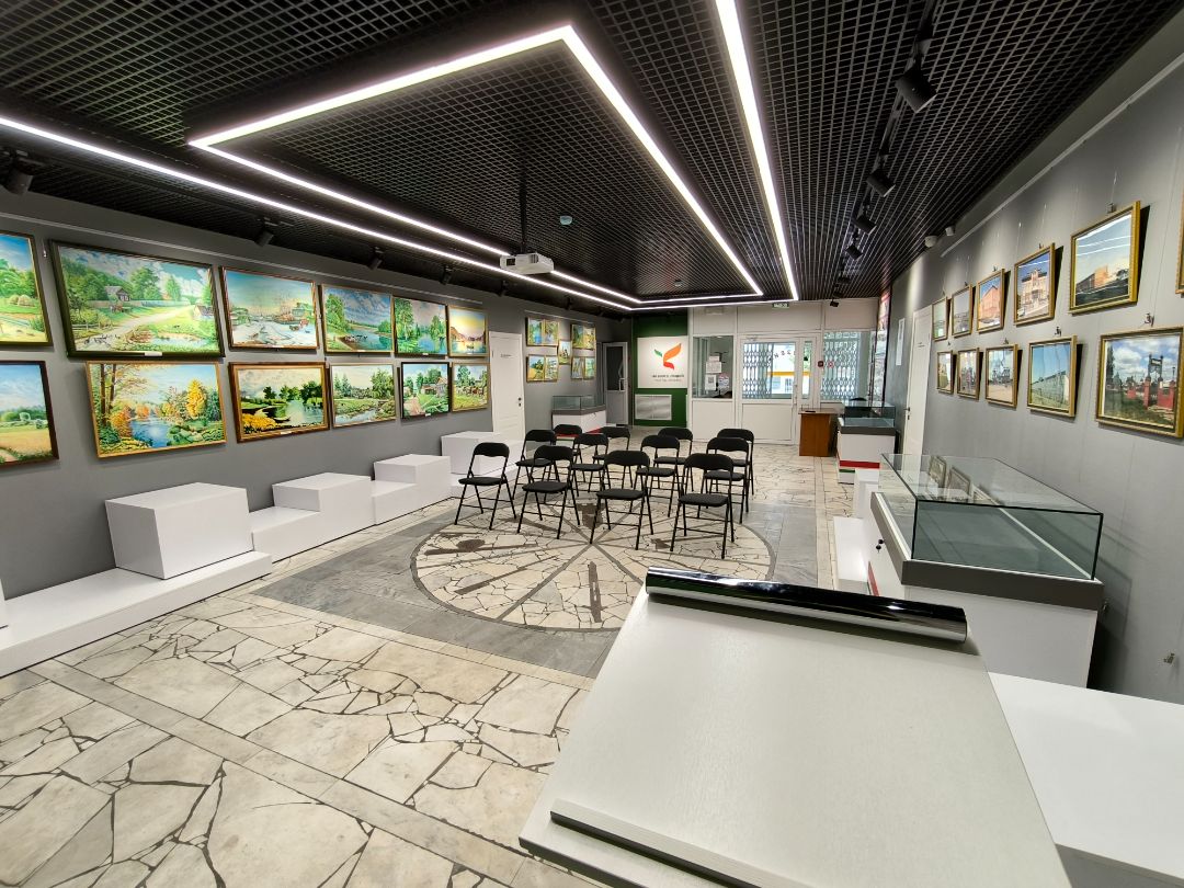 Холл 1 этажа – пространство для проведения презентаций, лекций, семинаров, встреч – есть проектор и экран, пространство для размещения стульев для гостей; временных выставок и экспозиций – на стенах предусмотрены направляющие для размещения.
