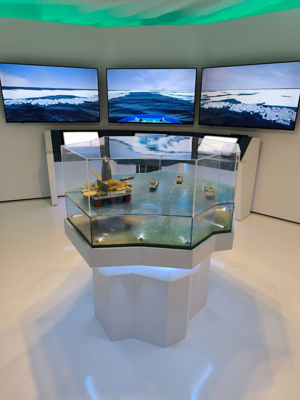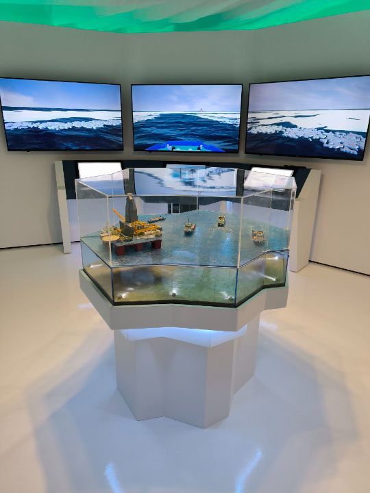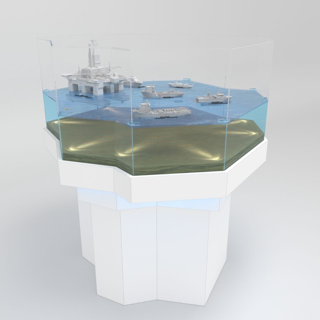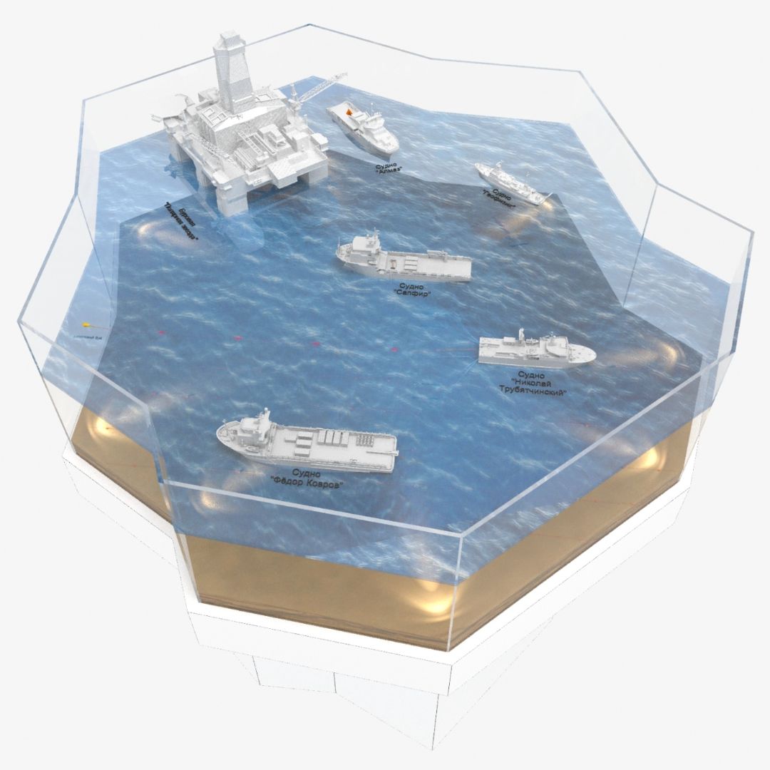 Макет условно разделен на 4 сектора. При движении по часовой стрелке вокруг макета можно наблюдать все основные этапы геологоразведки морского месторождения: