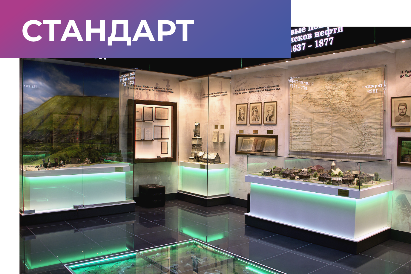 - Оснащение «Стандарт» - подразумевается оформление экспозиции индивидуальными витринами и стендами минималистичного дизайна, дополненные масштабными макетами и диорамами.