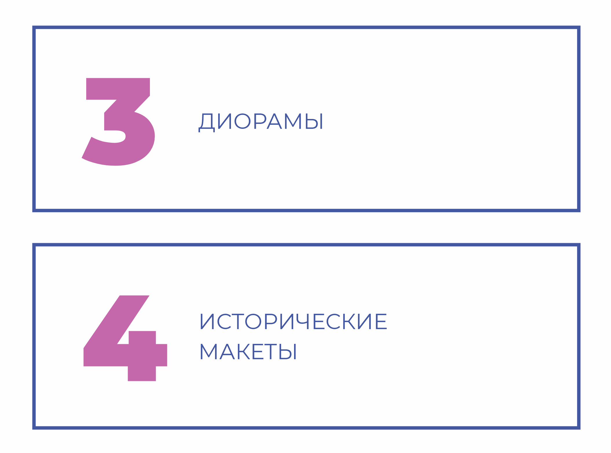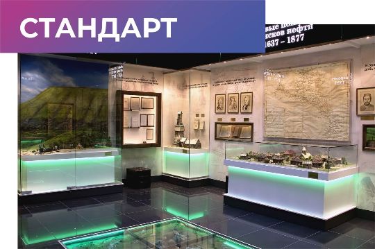 • Оснащение «Стандарт» - подразумевается оформление экспозиции индивидуальными витринами и стендами минималистичного дизайна, дополненные масштабными макетами и диорамами.