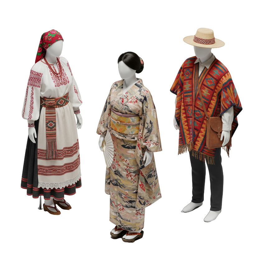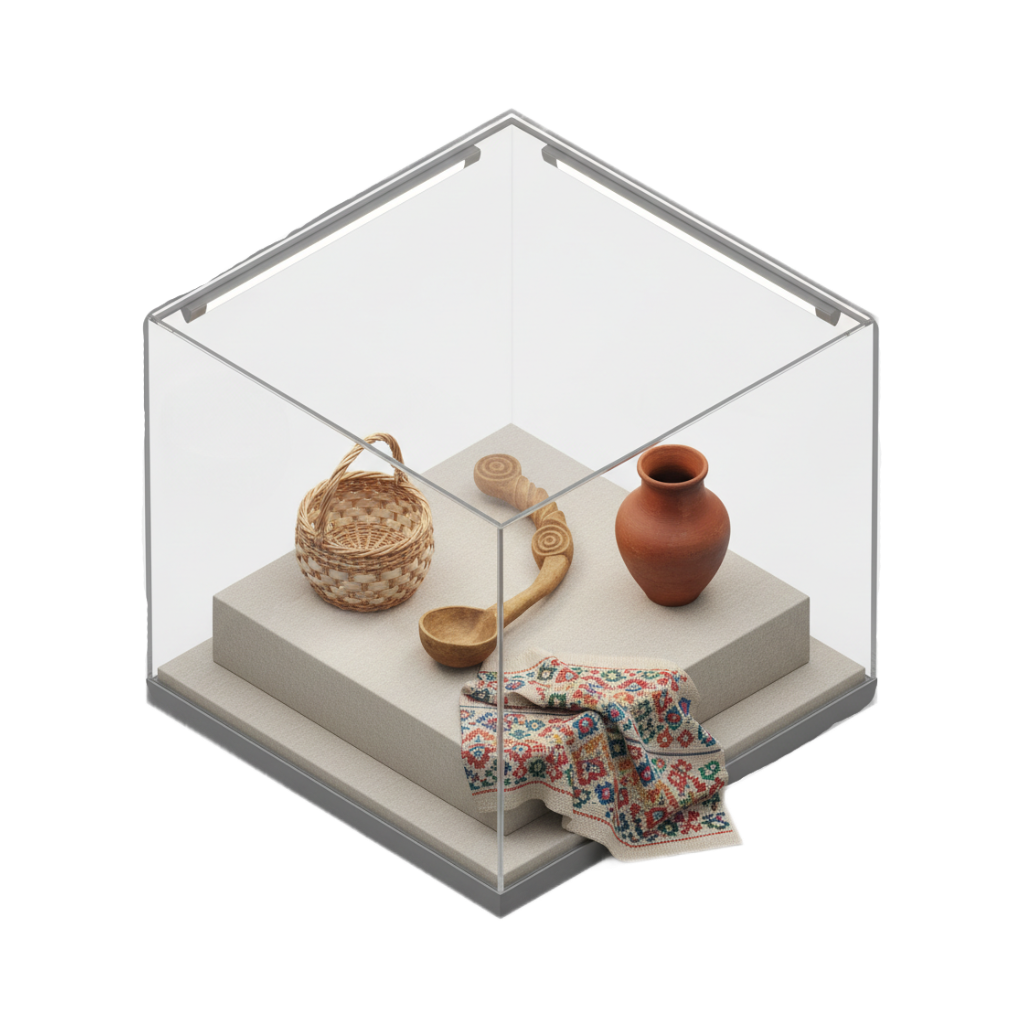Подлинные или максимально достоверные реплики предметов утвари и экспонатов, демонстрирующие быт народа. Рядом возможен сенсорный экран с анимацией, показывающей, как этим пользовались.